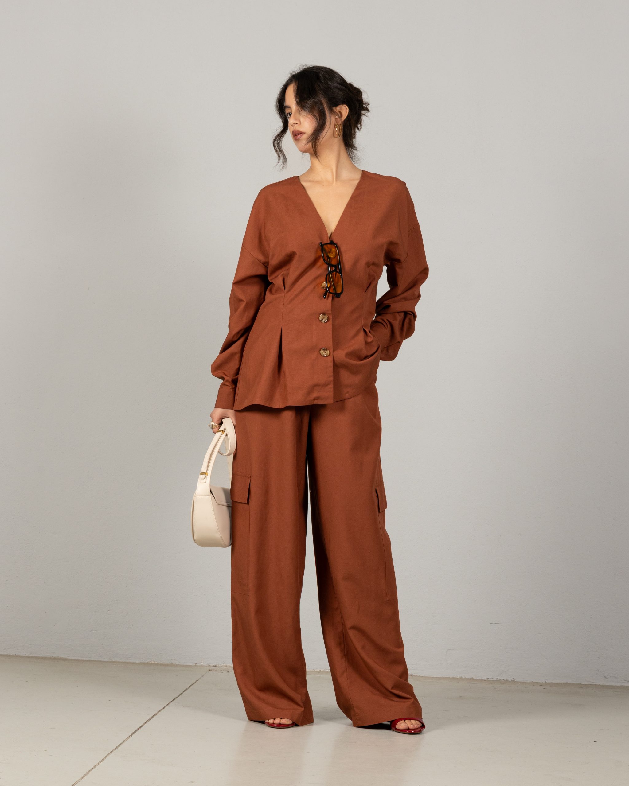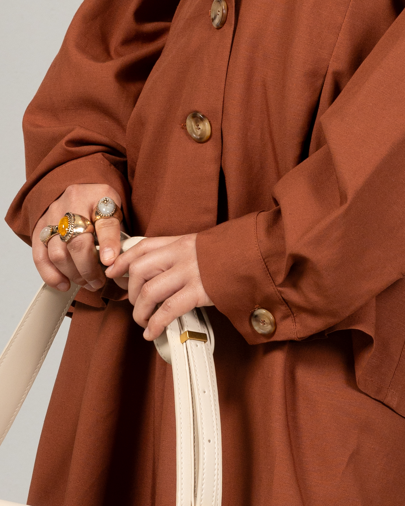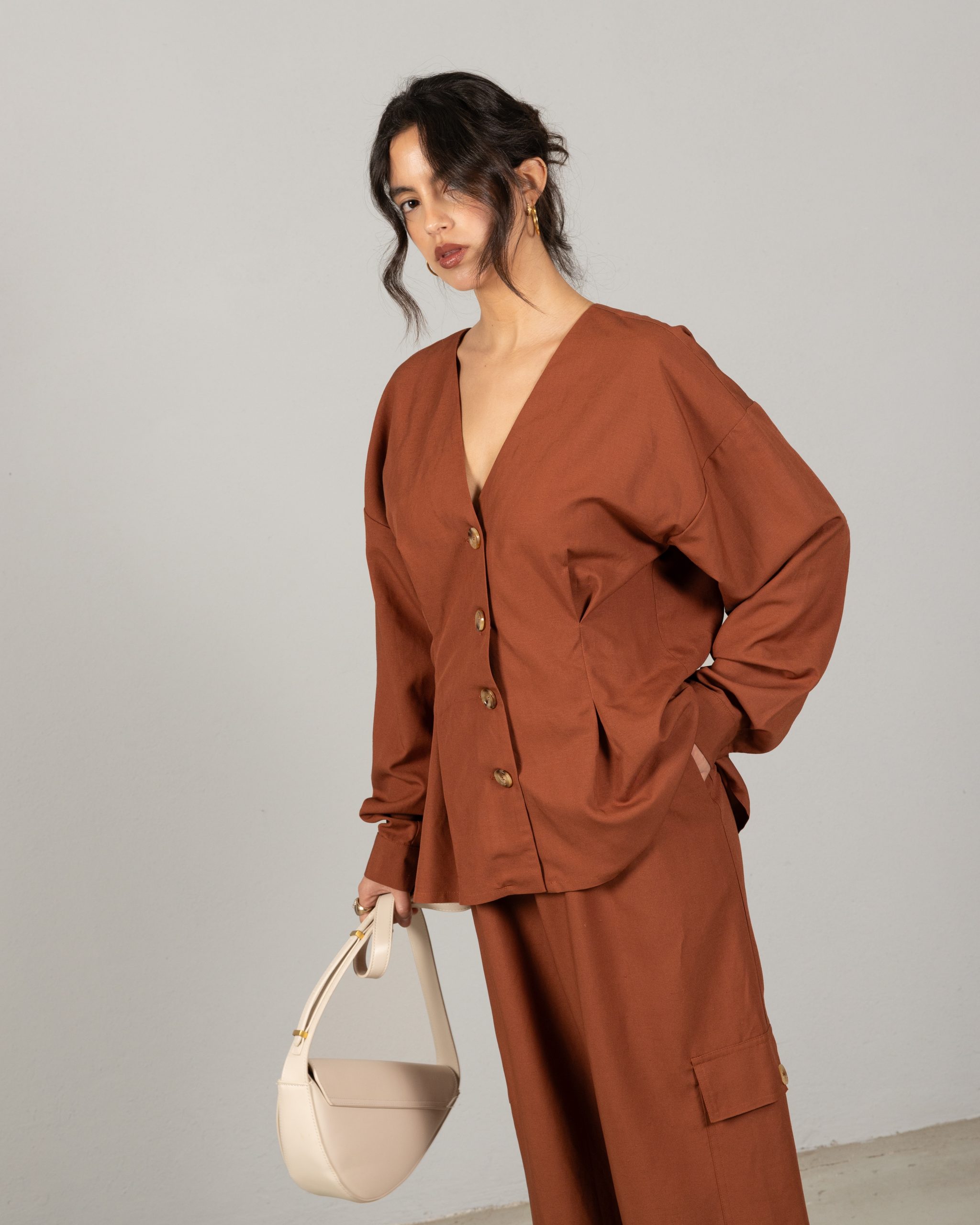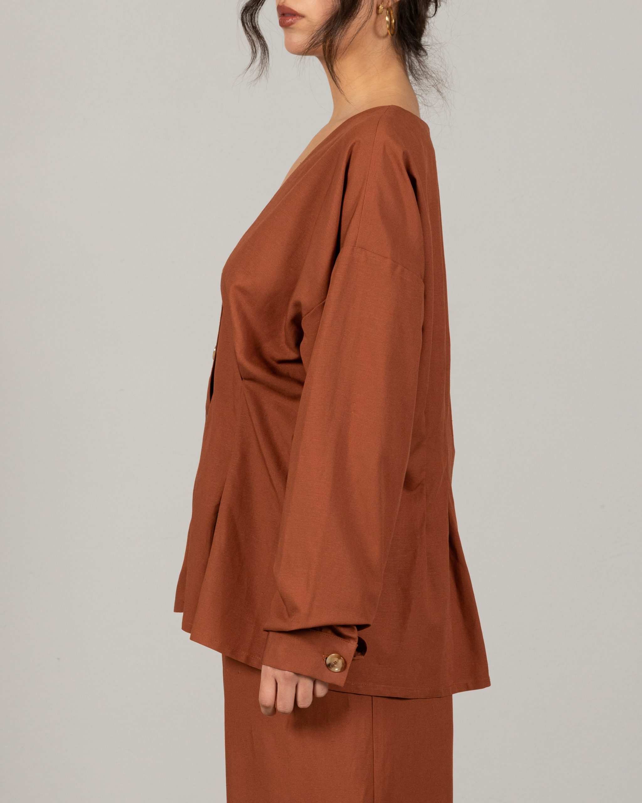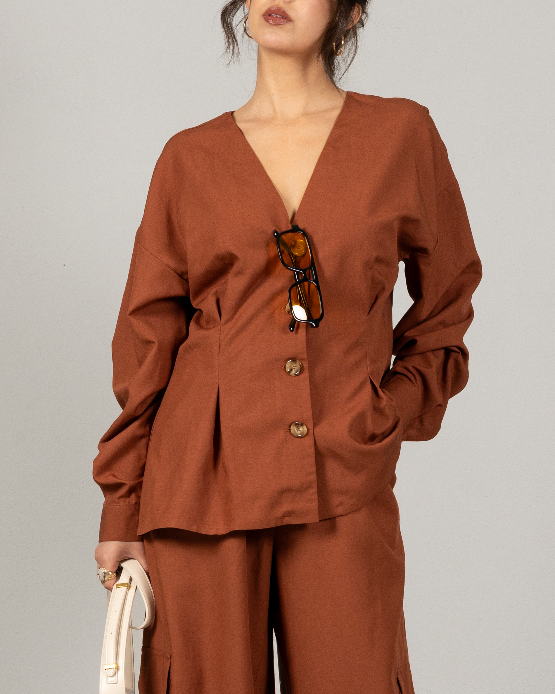 Camicia e non solo in tessuto fluido di viscosa lino, scollo a “V”, con motivo di riprese in vita che la rende un capo femminile e diverso dal solito, molto bella da indossare a nudo, ma altrettanto particolare nella versione aperta con top sotto, stile giacca camicia. Diventa meravigliosa con il suo pantalone Varadero da indossare in una versione tuta, tutta da scoprire. Polsino al fondo con bottone e abbottonatura a vista sul davanti.