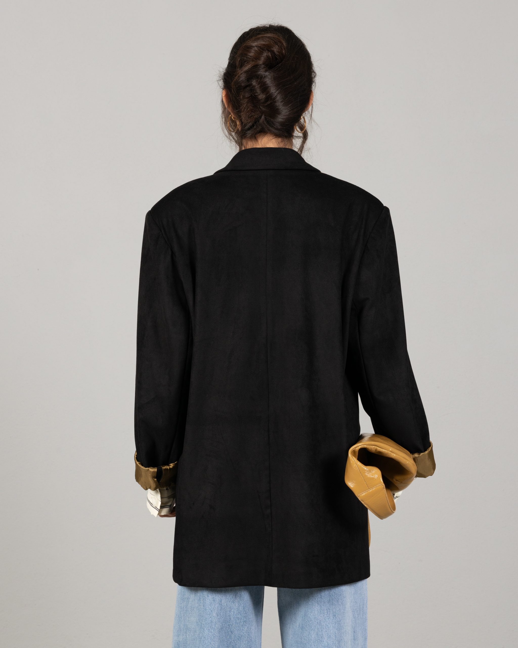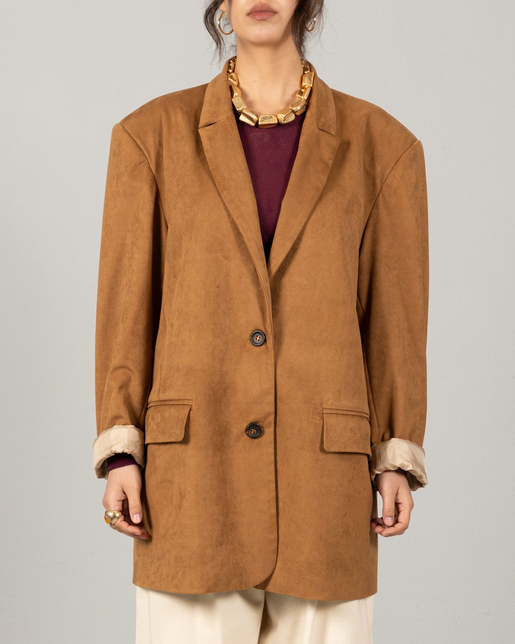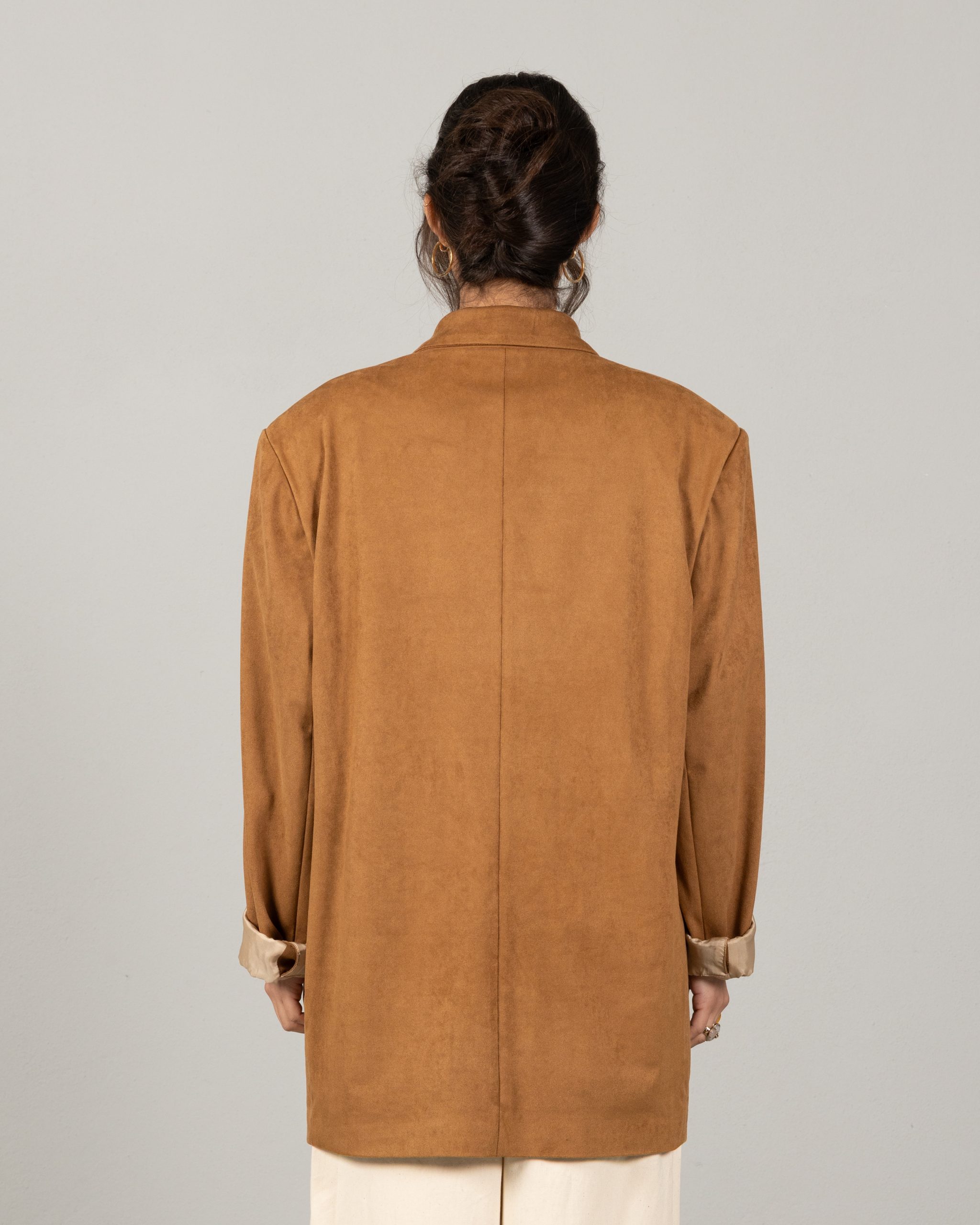 Capospalla in eco-camoscio dalla linea over monopetto a due bottoni, foderata in contrasto. Spacco con bottone sul fondo manica. Un perfetto attacco stagione da indossare sopra a felpe, completi o camicie.