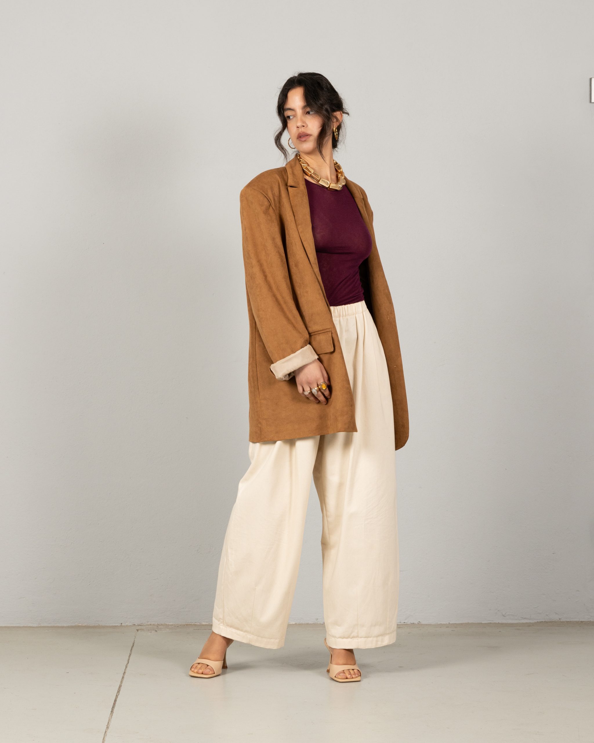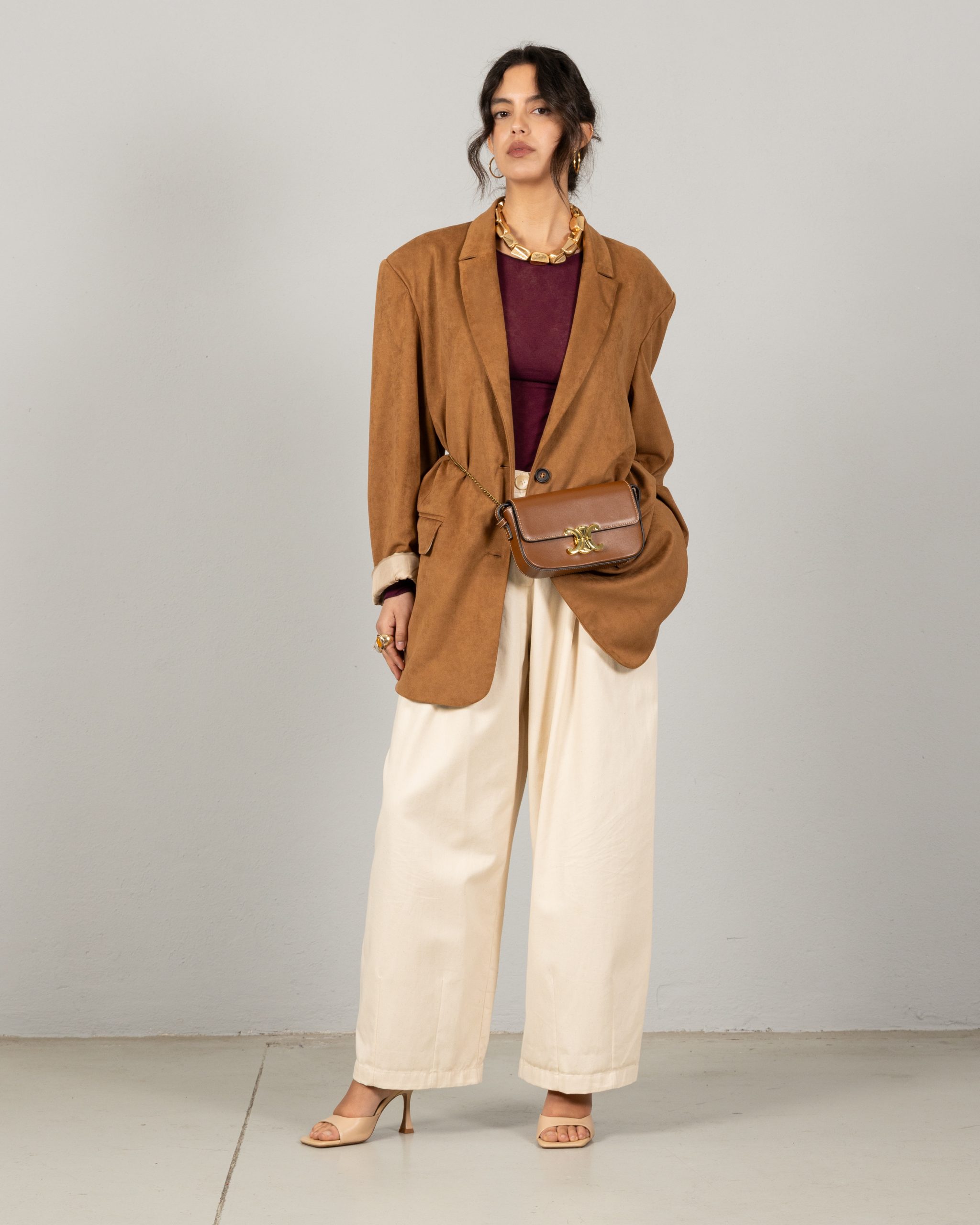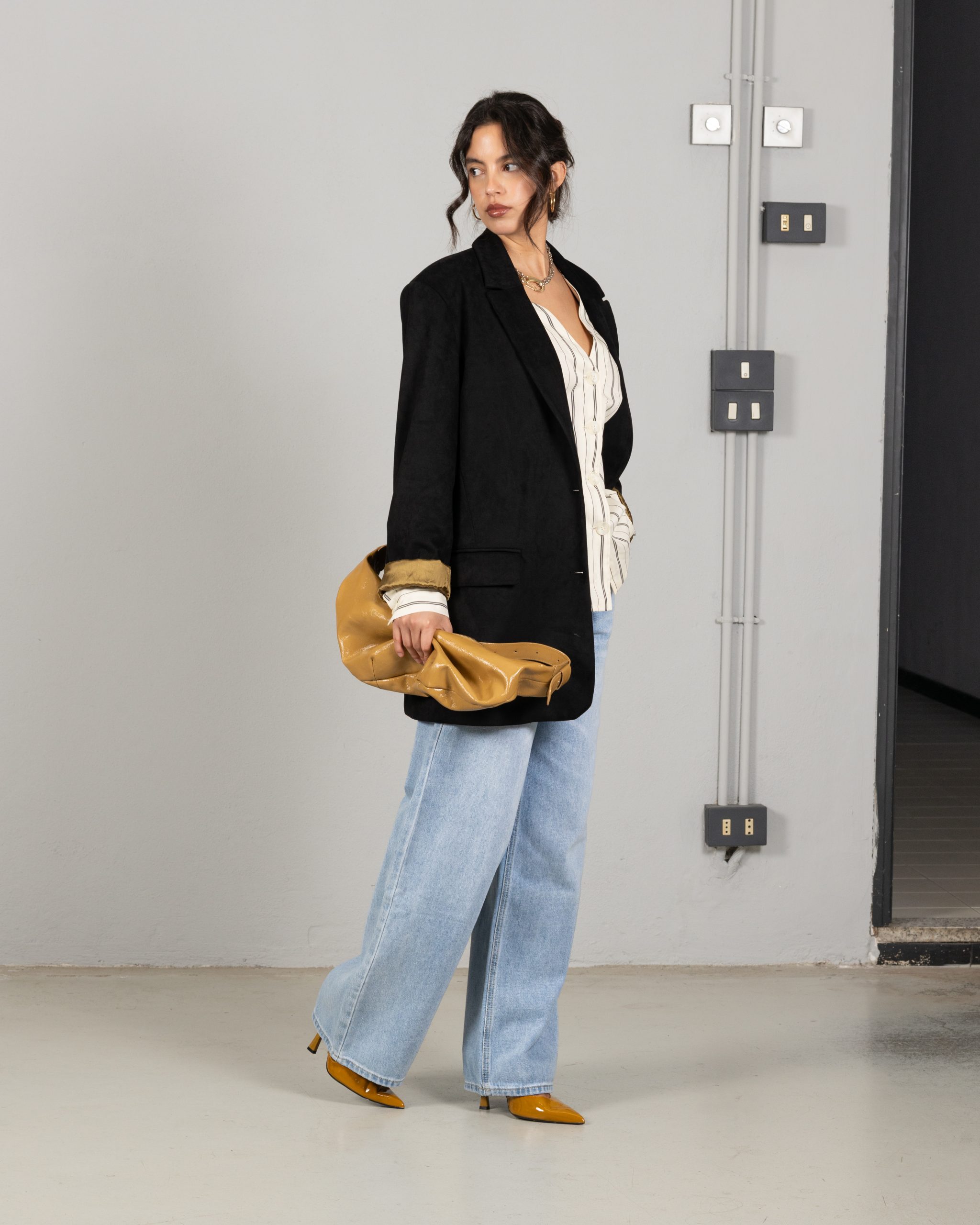 Capospalla in eco-camoscio dalla linea over monopetto a due bottoni, foderata in contrasto. Spacco con bottone sul fondo manica. Un perfetto attacco stagione da indossare sopra a felpe, completi o camicie.