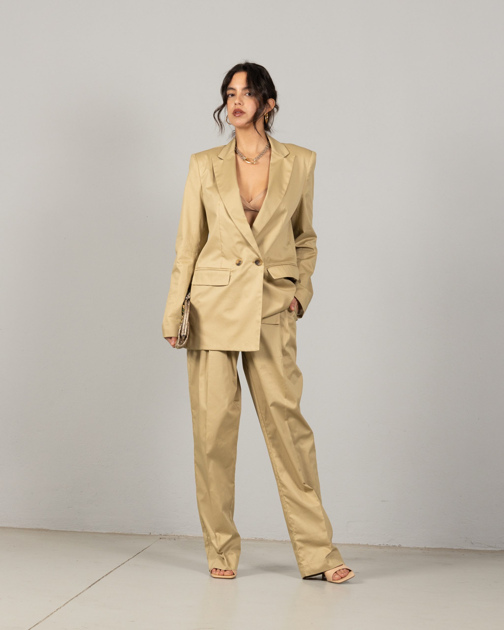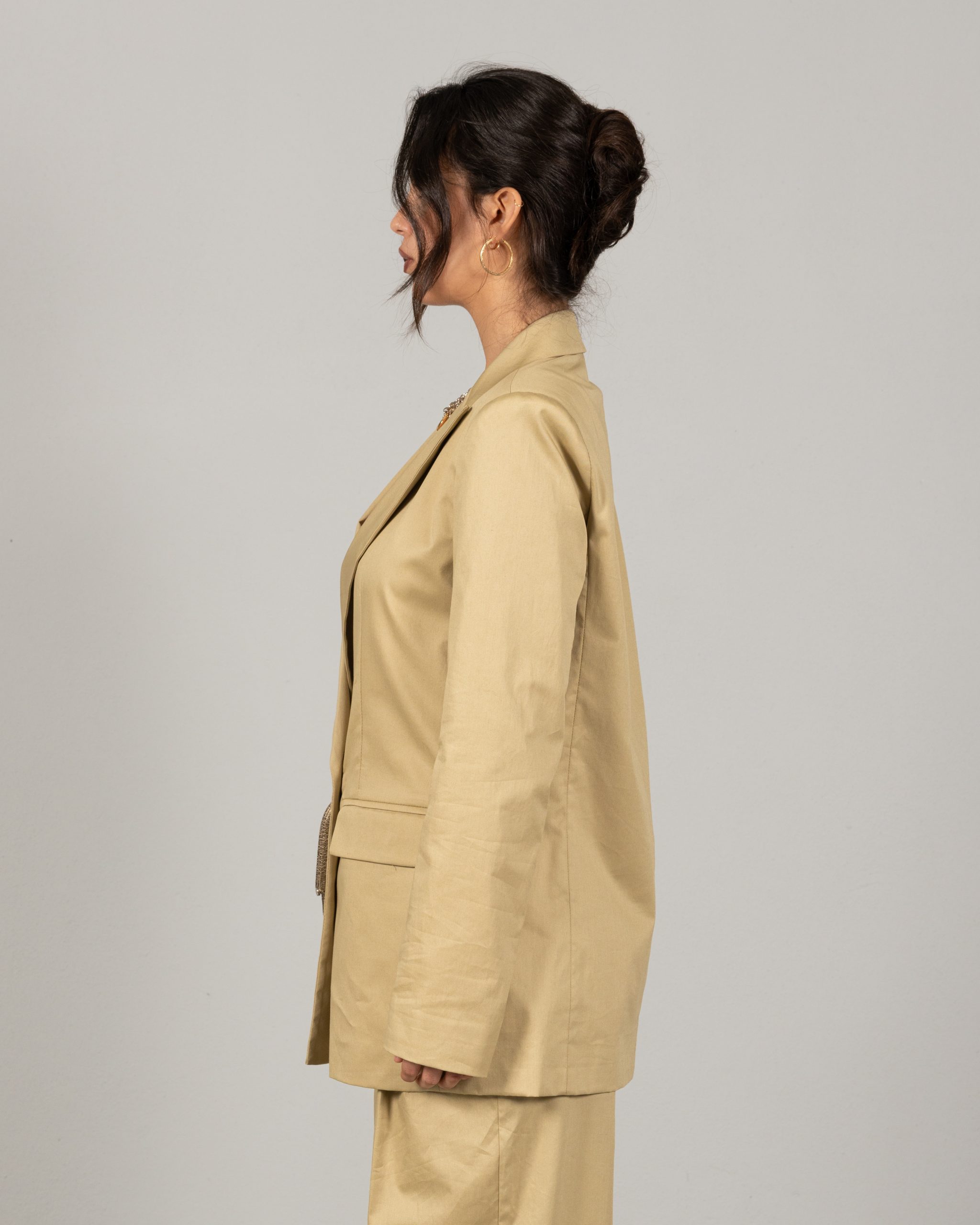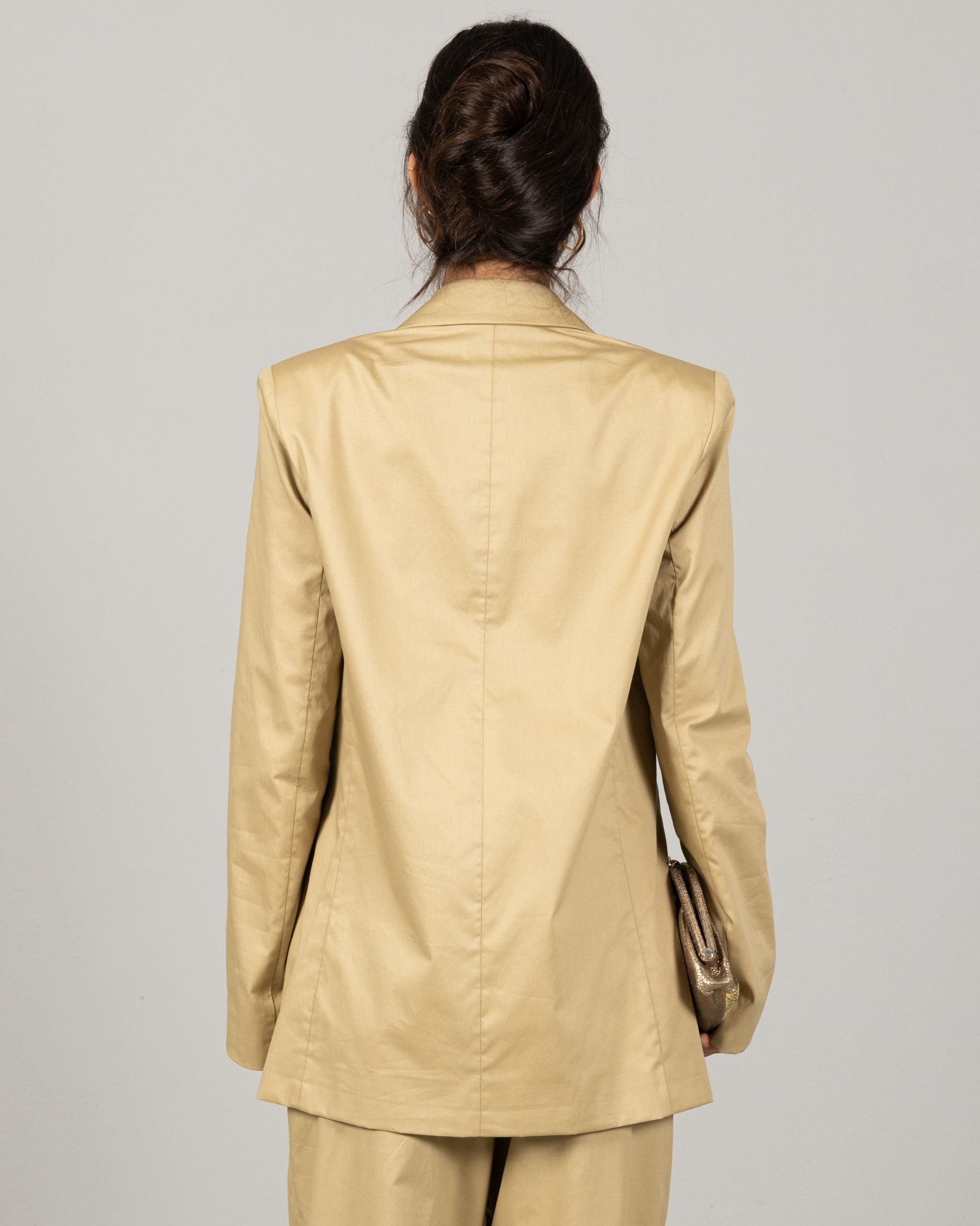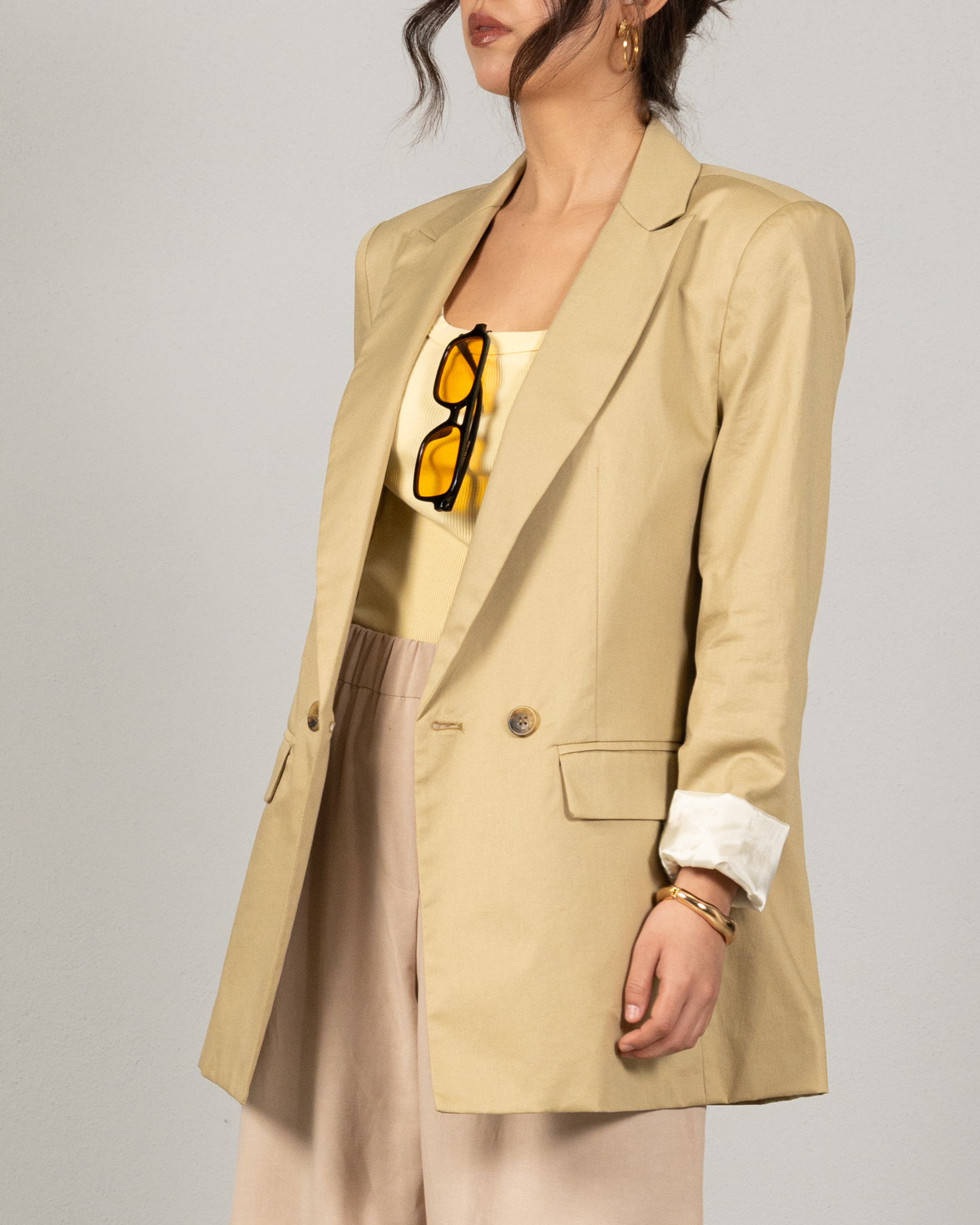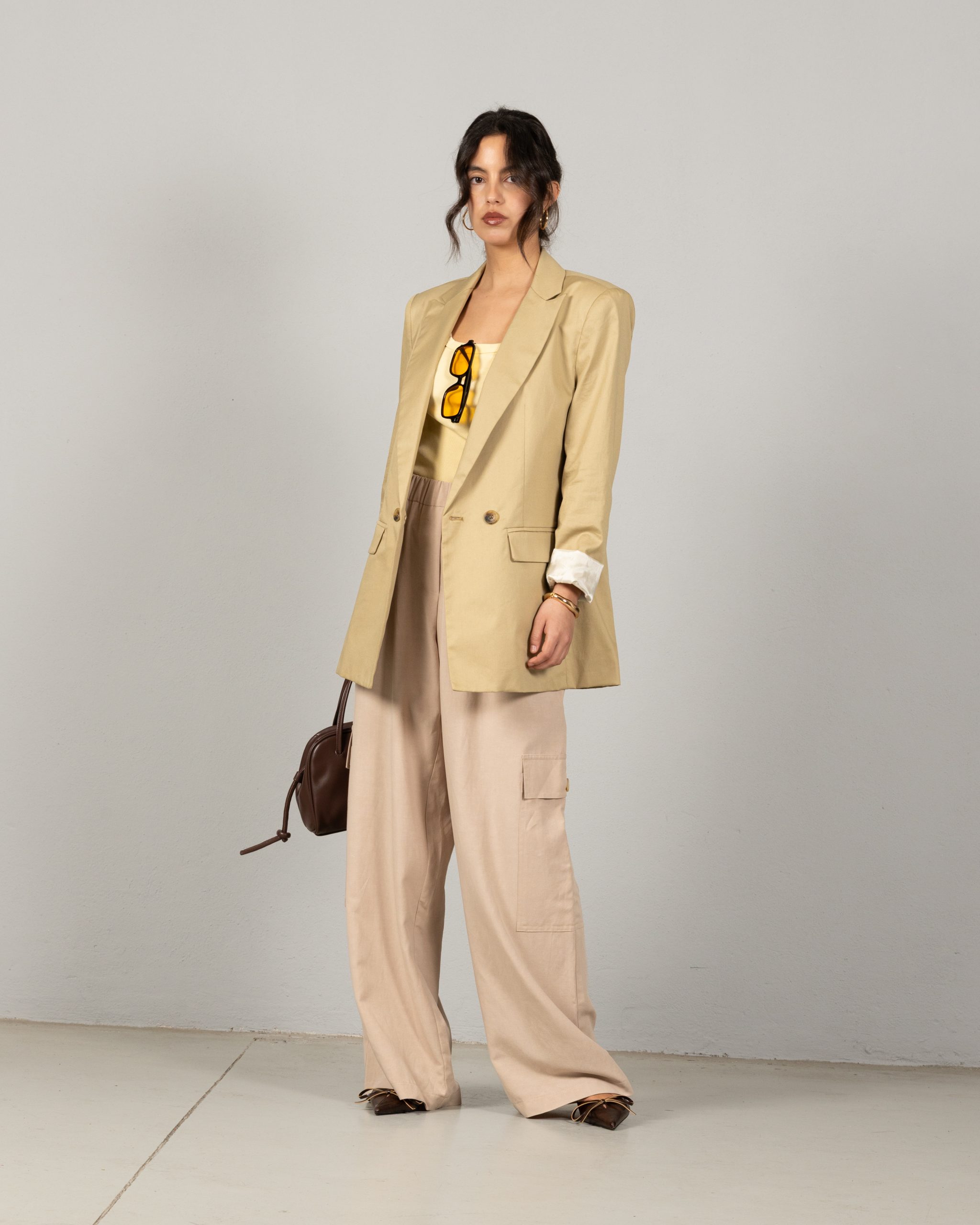 Blazer dal taglio sartoriale in un meraviglioso tessuto twill 100% cotone, dalla linea dritta e morbida con leggero doppiopetto. Foderato in tono leggermente più chiaro. Da indossare spezzata con denim o pantalone bianco oppure a completo con il suo pantalone Cactus.
