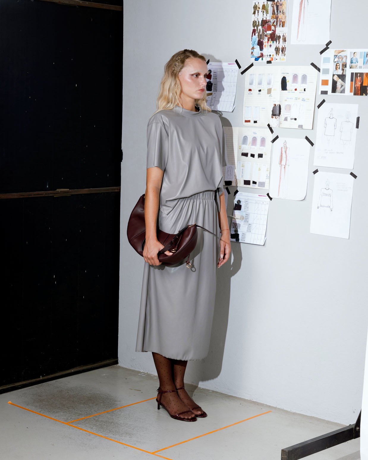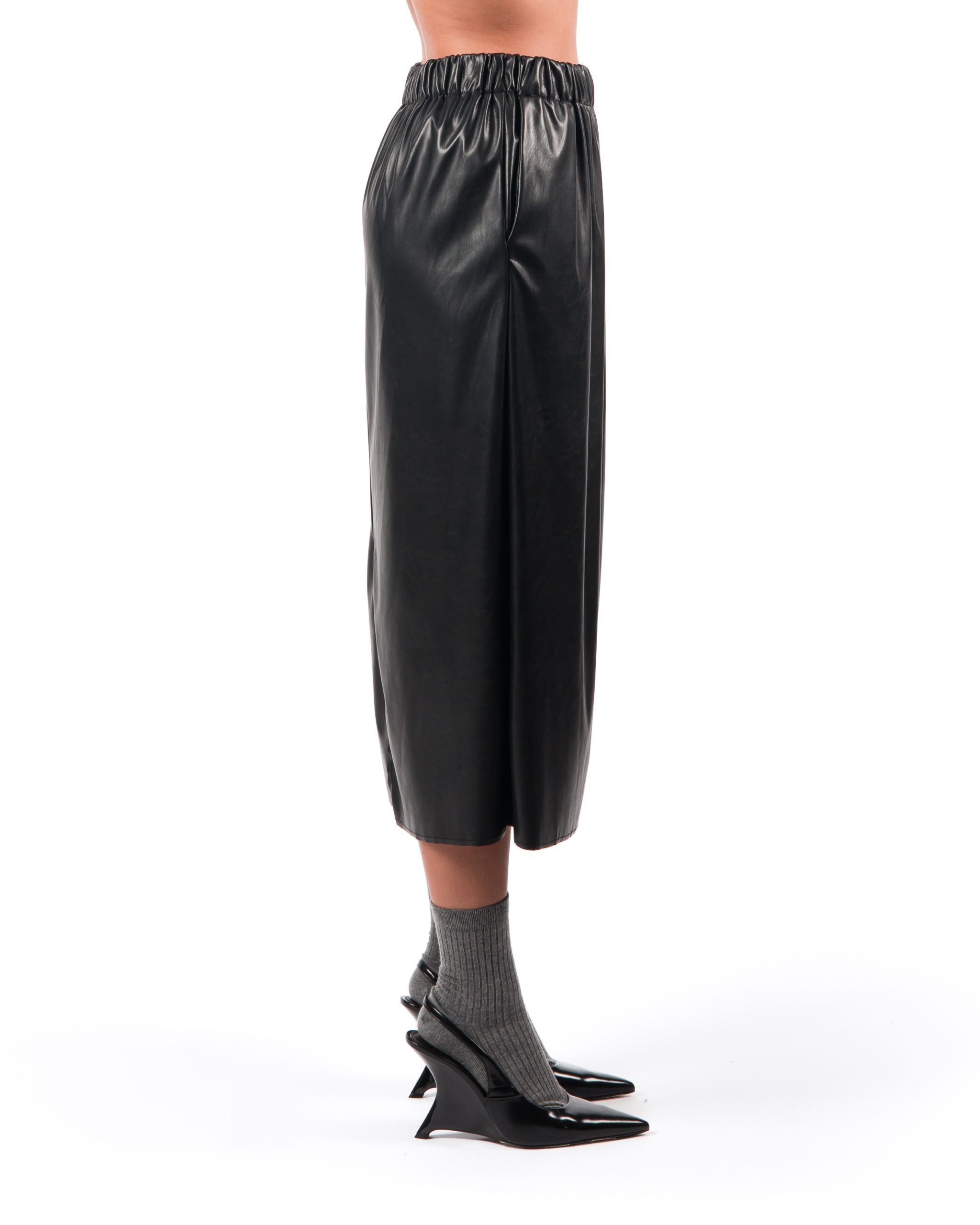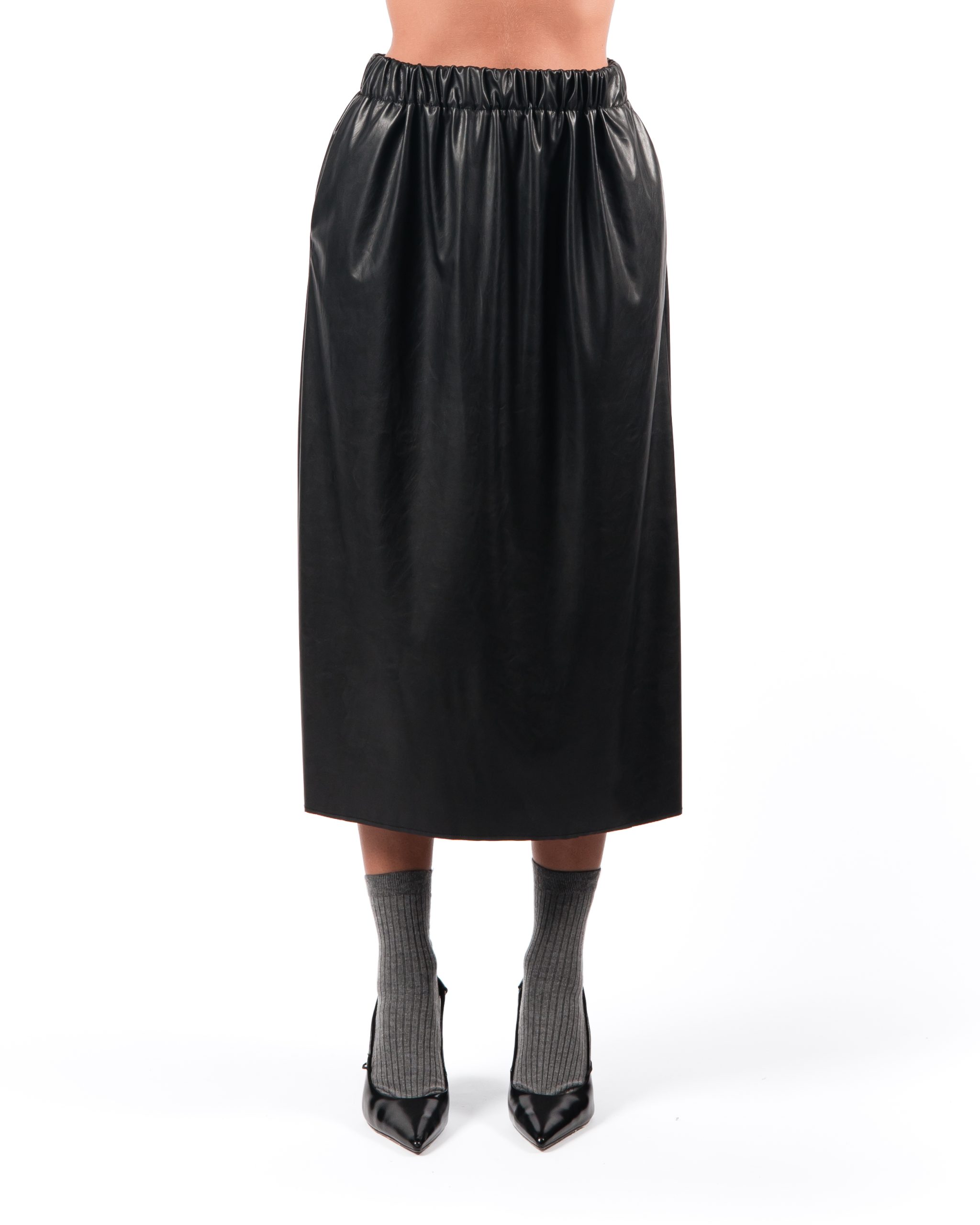 Gonna lunghezza midi in ecopelle con elastico in vita tasche laterali e spacchetto sul dietro. Orlo taglio vivo.
