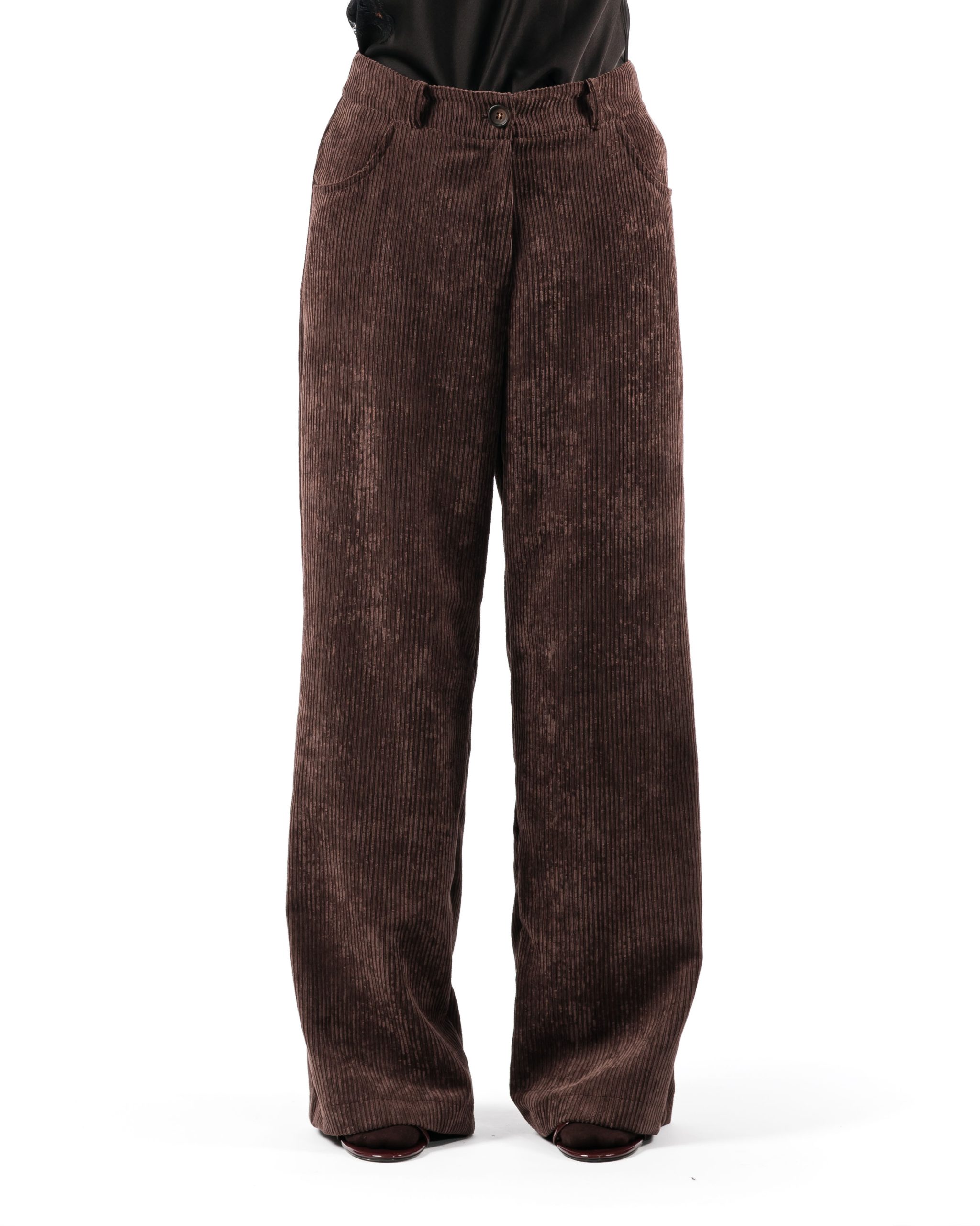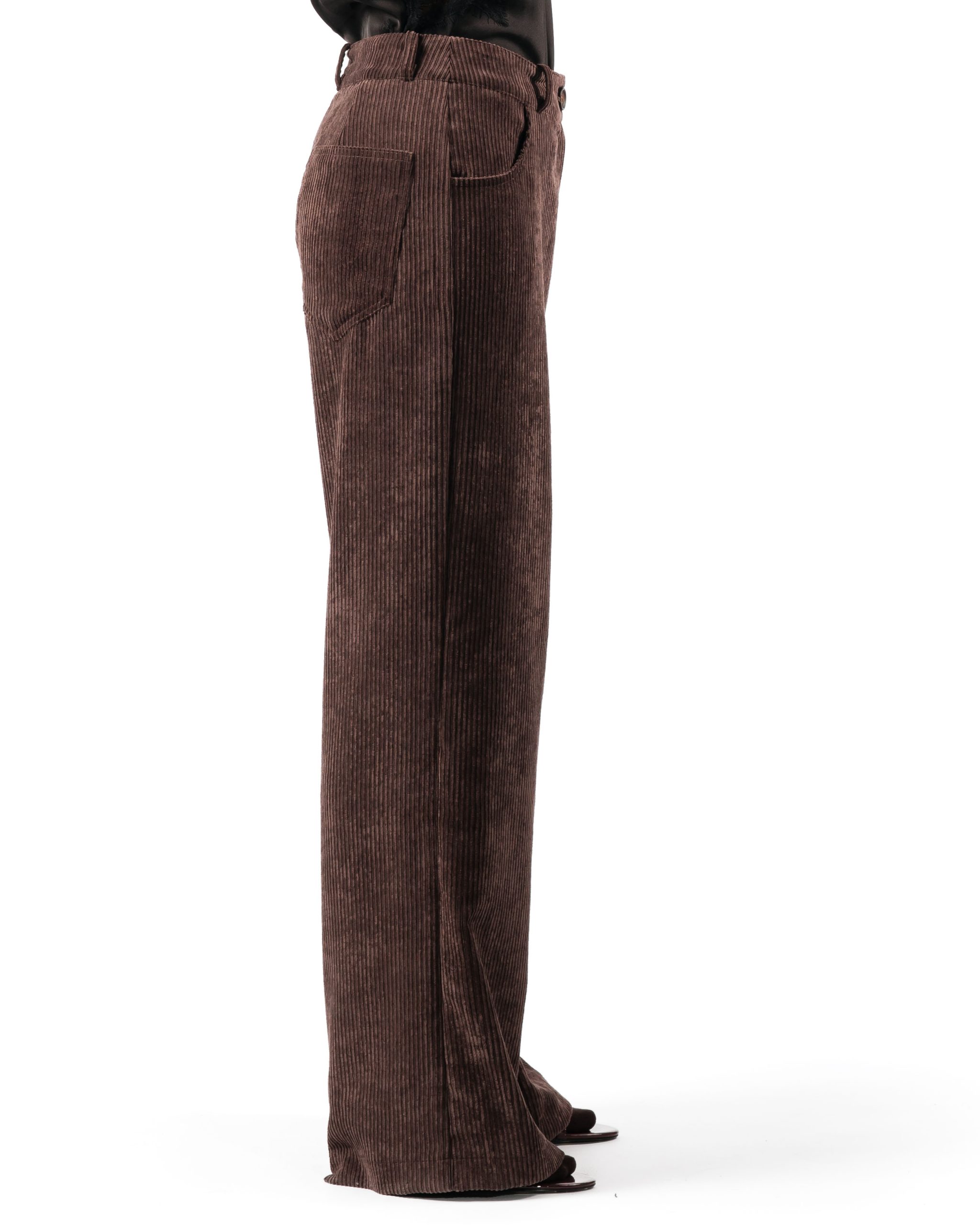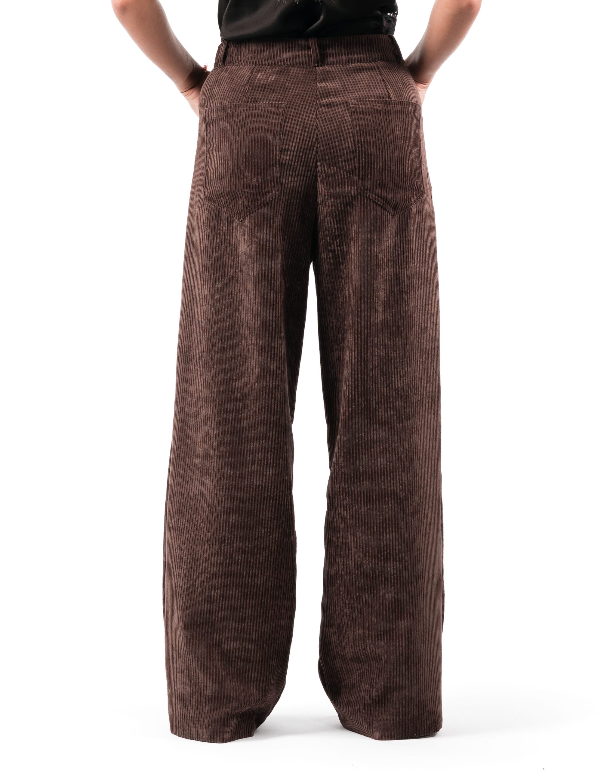 Pantalone palazzo in velluto a coste irregolari, tasche a jeans davanti e dietro.