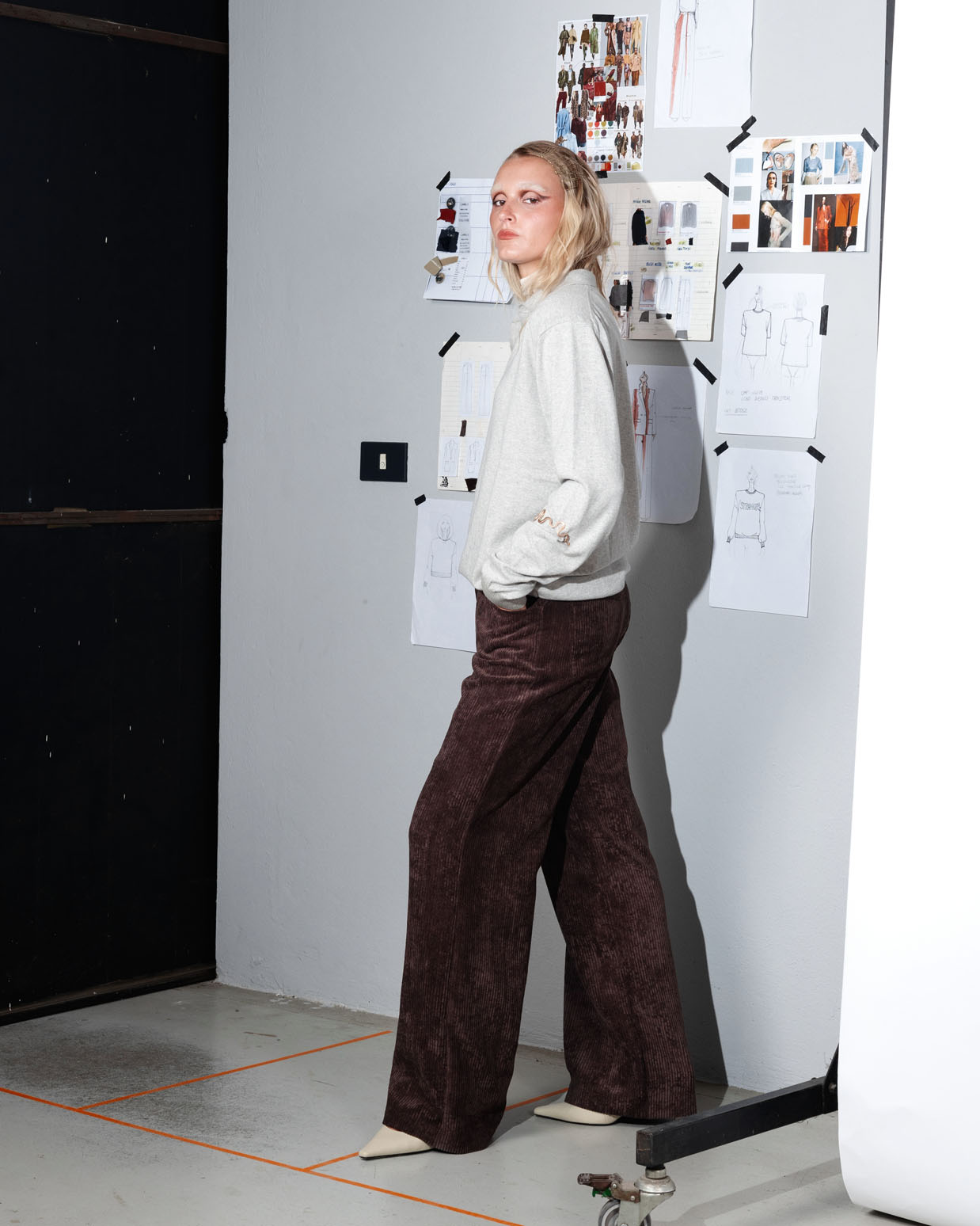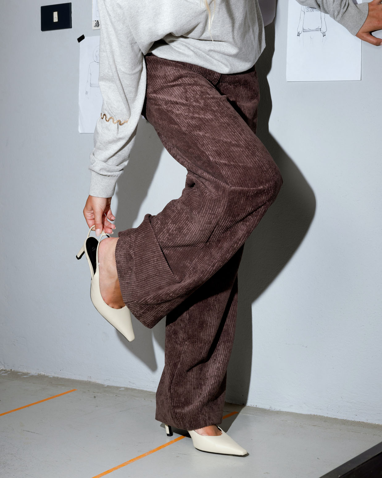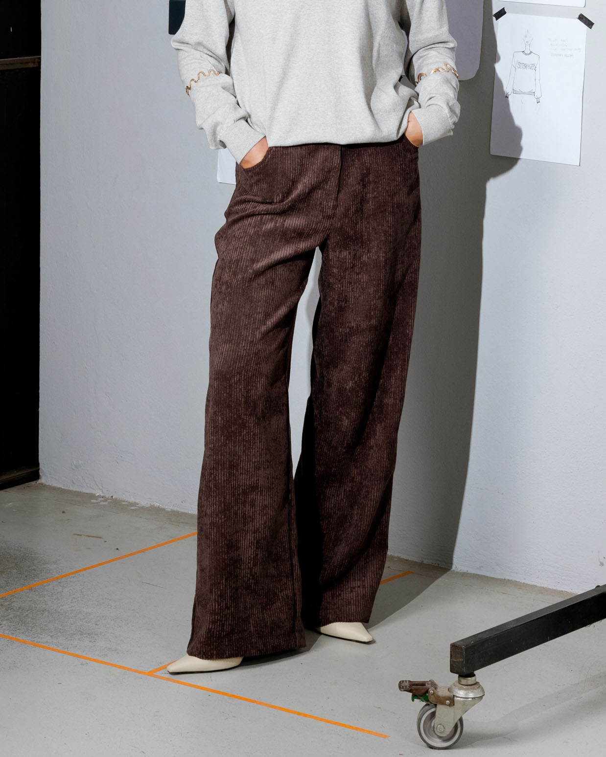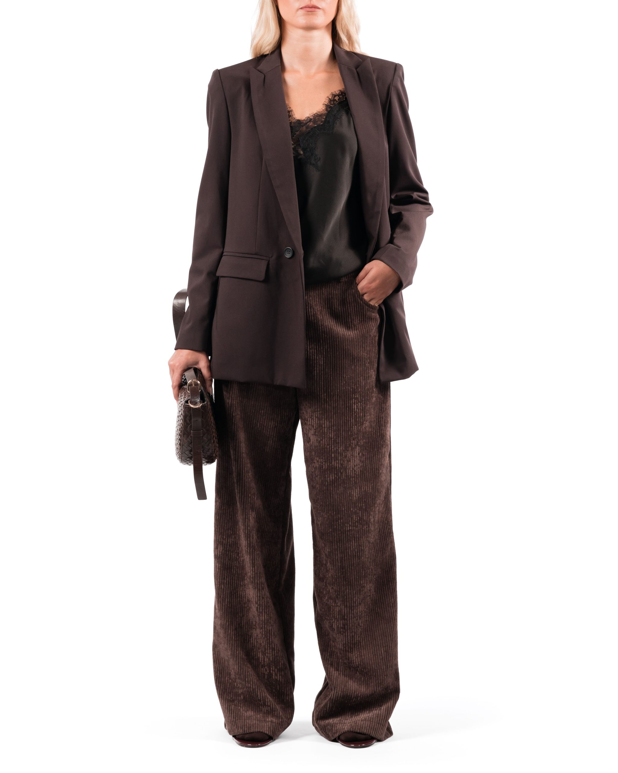 Pantalone palazzo in velluto a coste irregolari, tasche a jeans davanti e dietro.