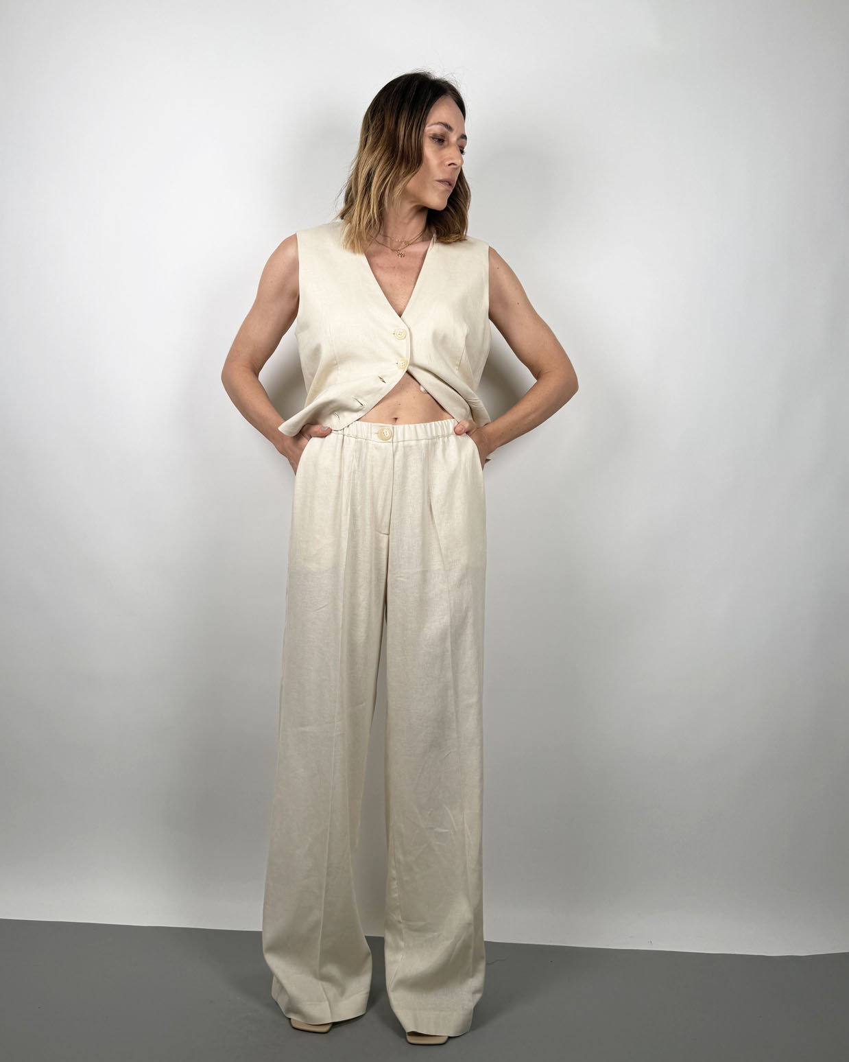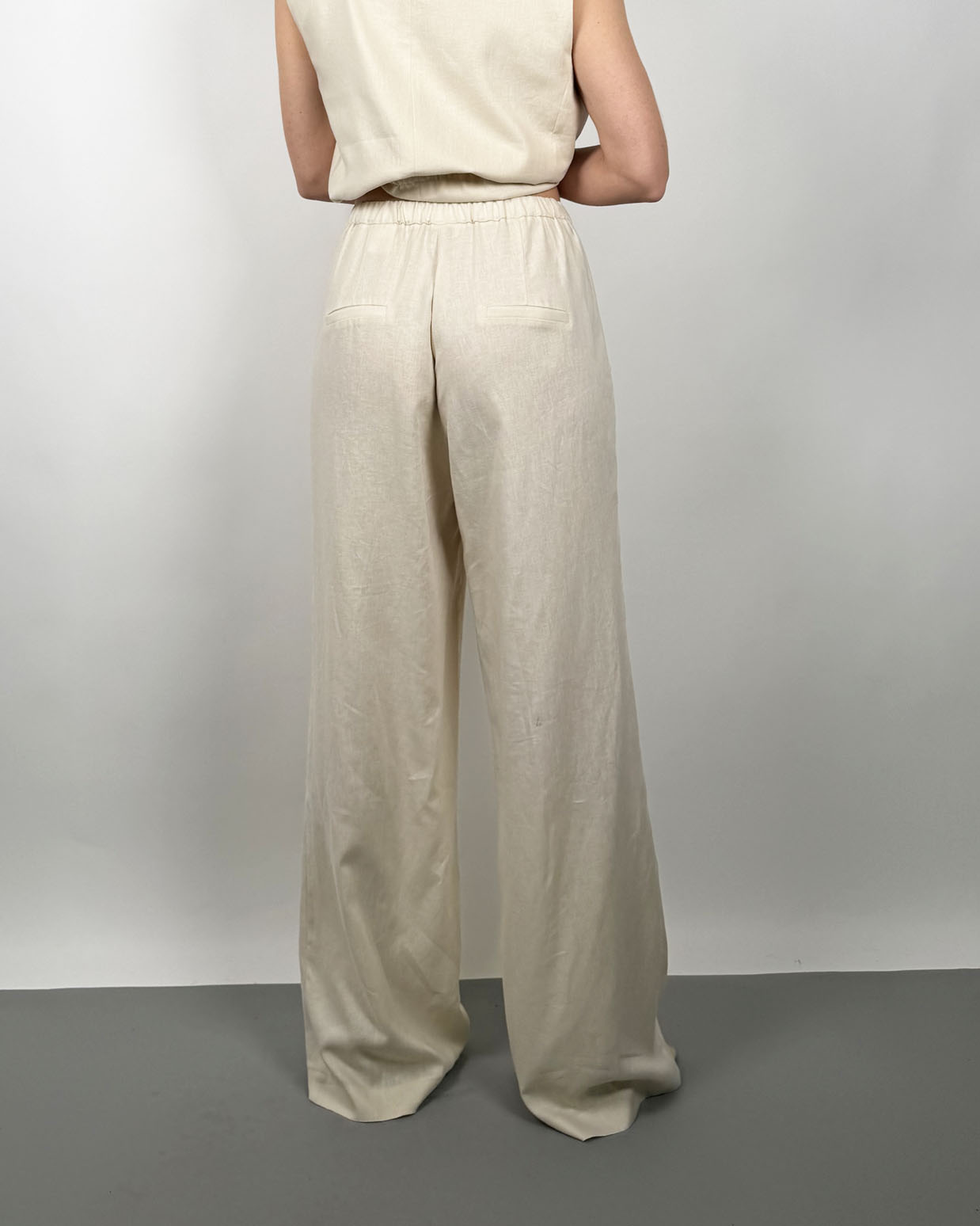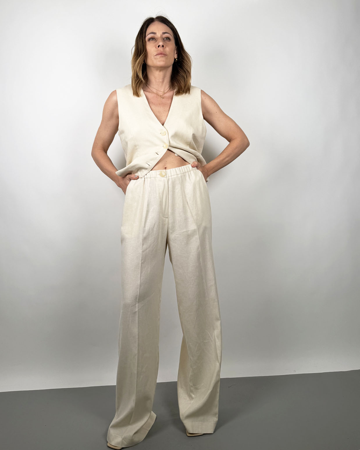 Pantalone comodo e confortevole con elastico in vita e bottone sul davanti, realizzato in un misto lino. Linea palazzo non troppo ampio.