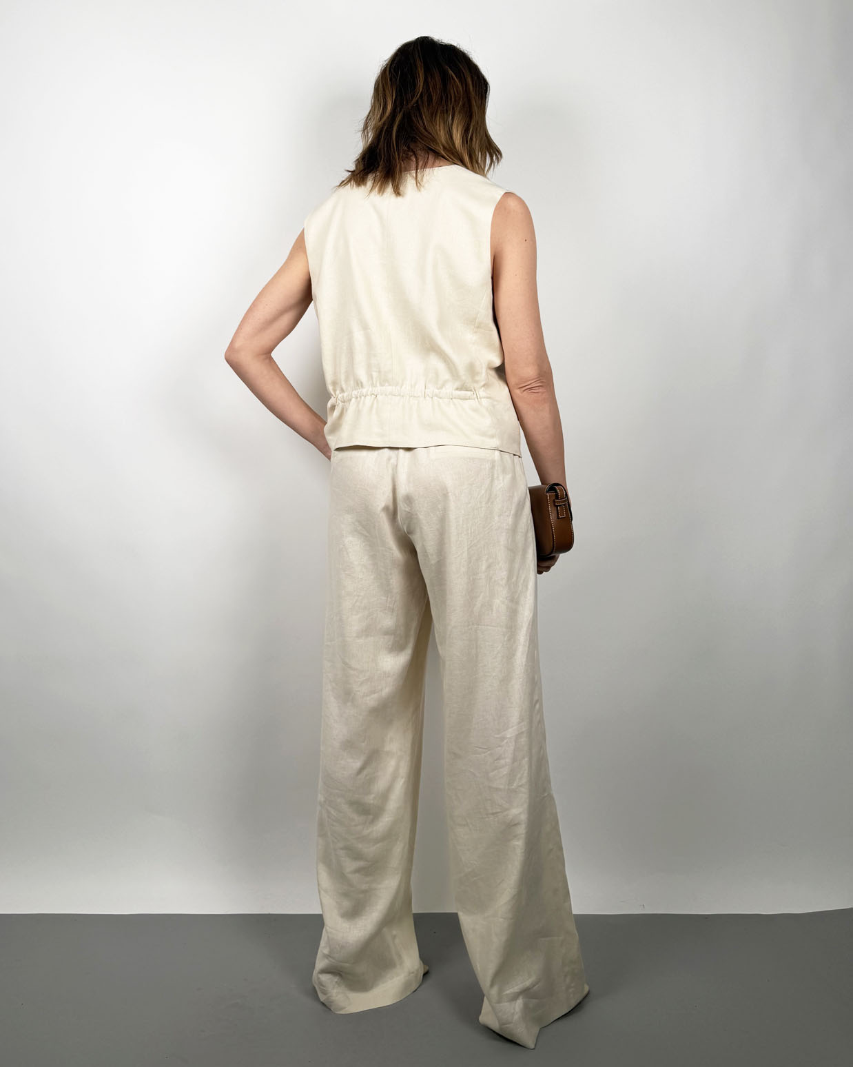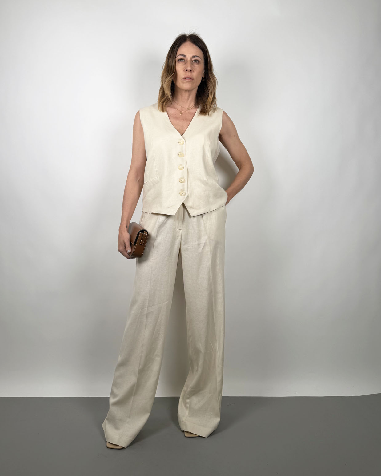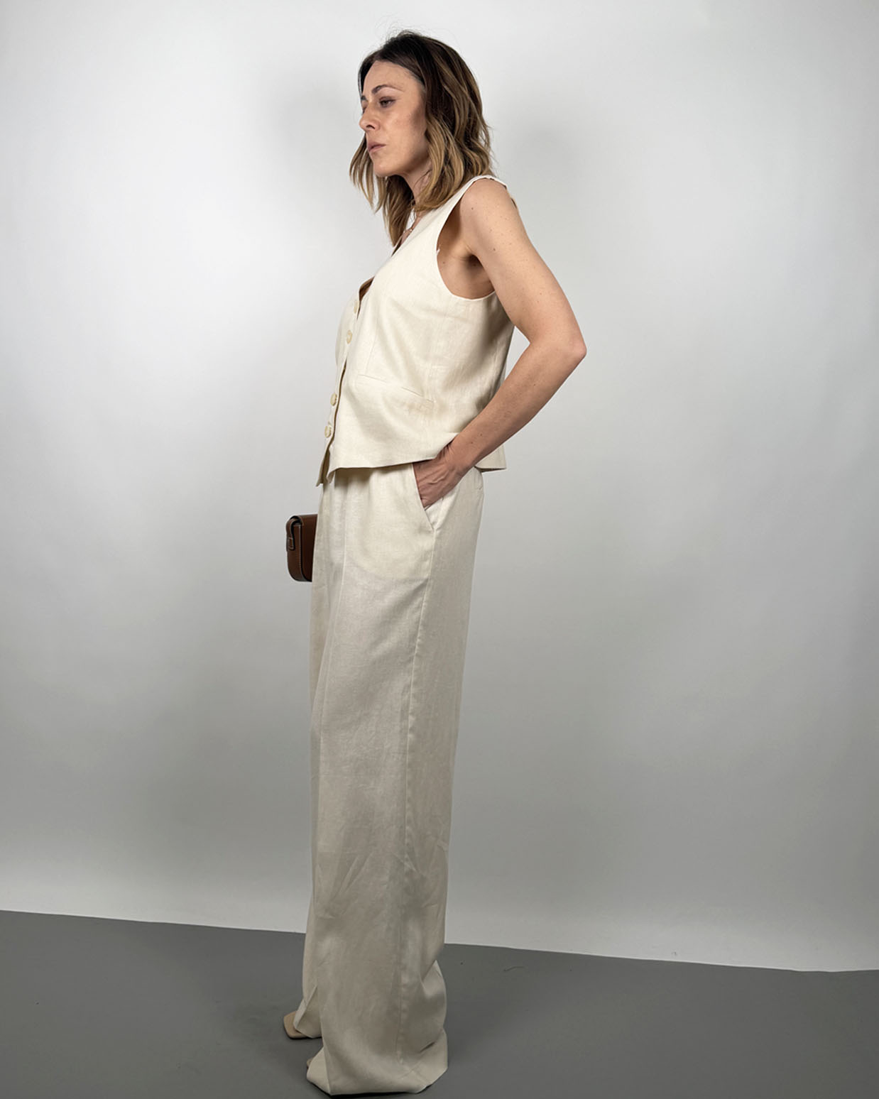 Pantalone comodo e confortevole con elastico in vita e bottone sul davanti, realizzato in un misto lino. Linea palazzo non troppo ampio.