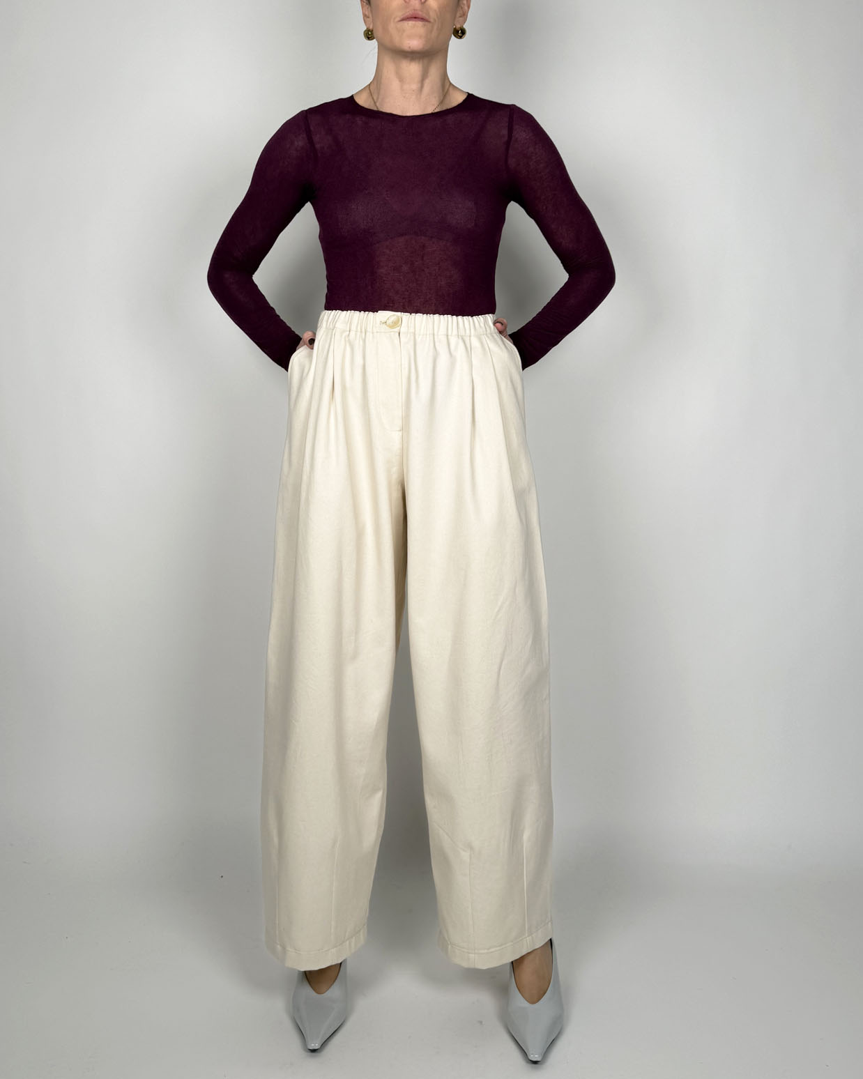 Pantalone comodo e confortevole realizzato in twill di cotone dall’aspetto grezzo e naturale. Linea ad ovetto con motivo riprese sul fondo gamba.