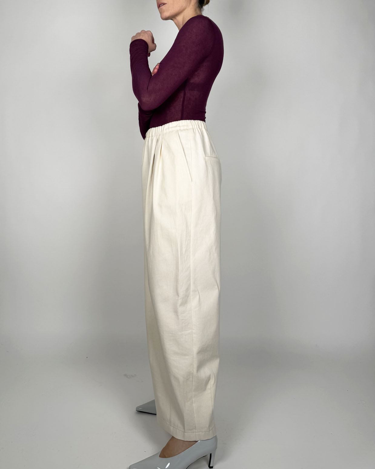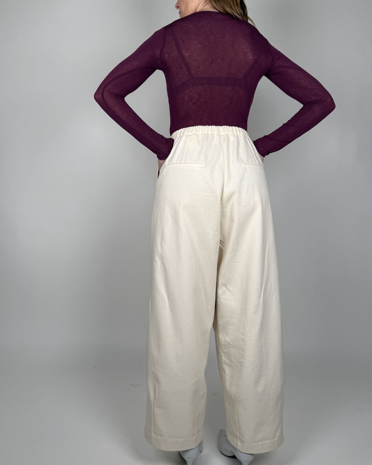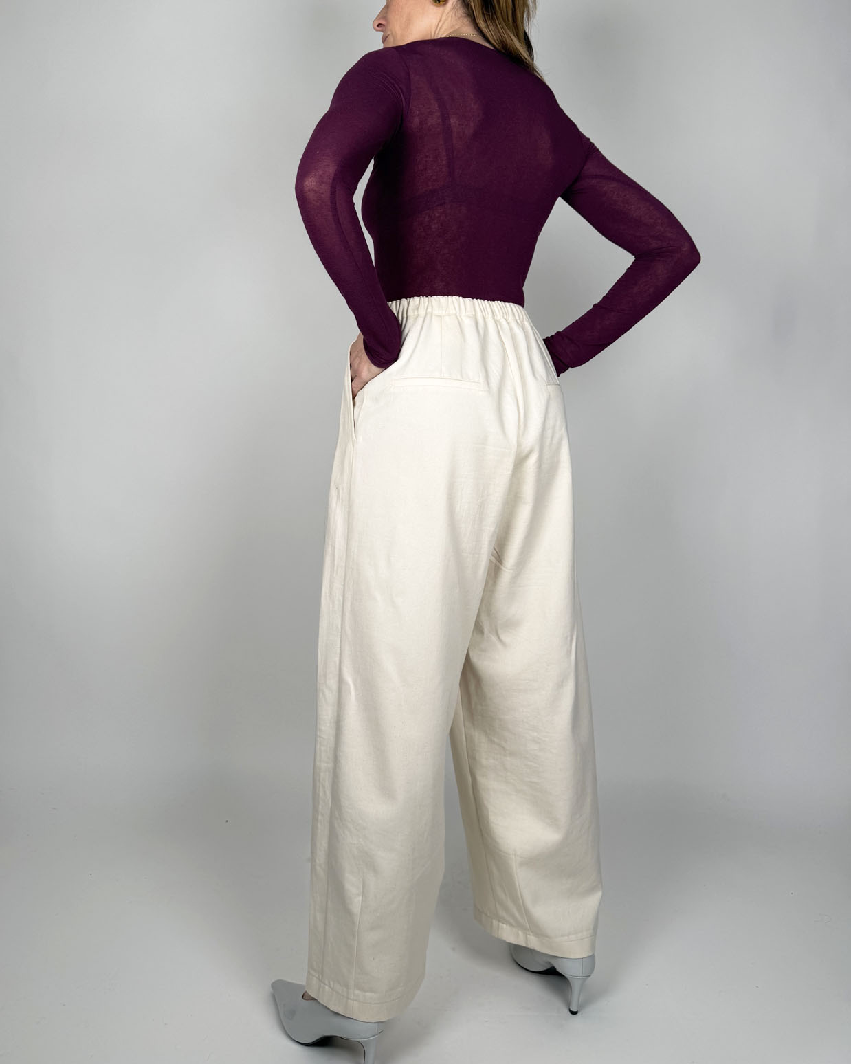 Doppia pinces sul davanti ed elastico 2cm inserito in vita, chiusura con zip e bottoni.