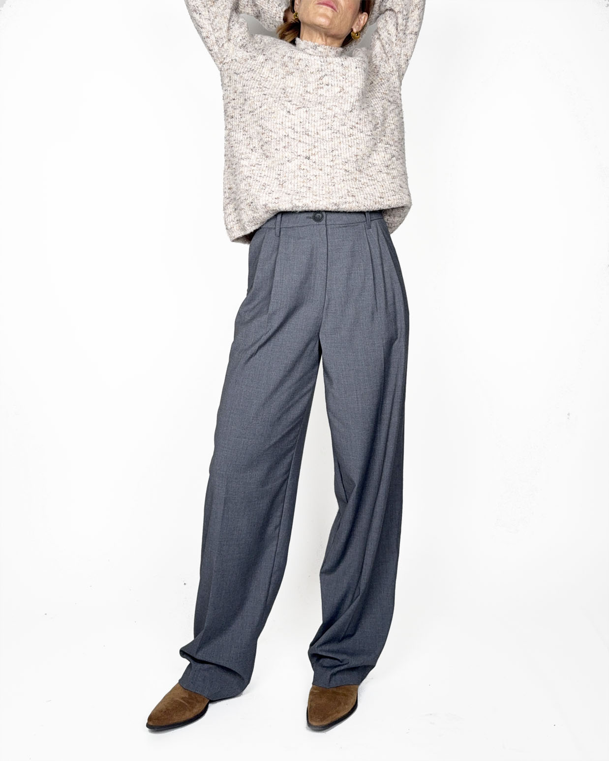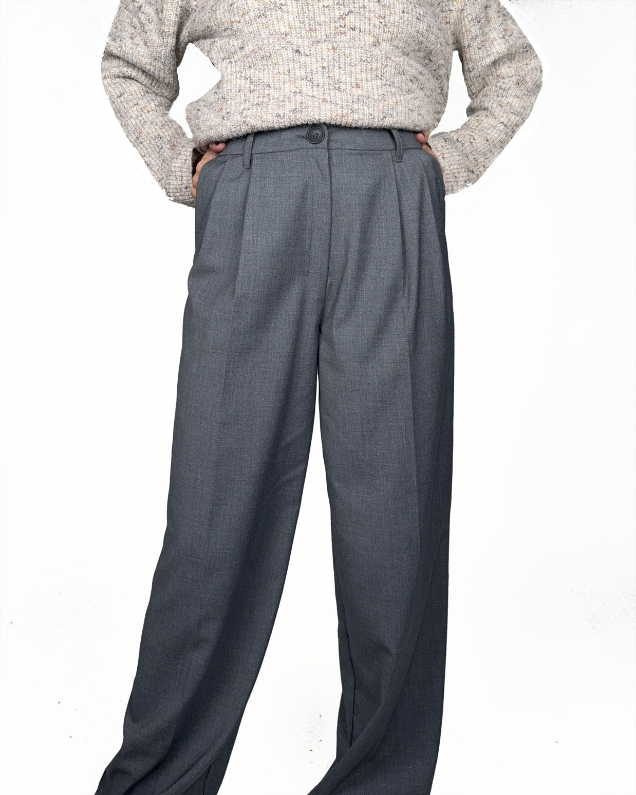 Pantalone lungo a vita alta in poliviscosa stretch, dalla mano morbida, con doppia pinces sul davanti e dietro intero senza fascione.