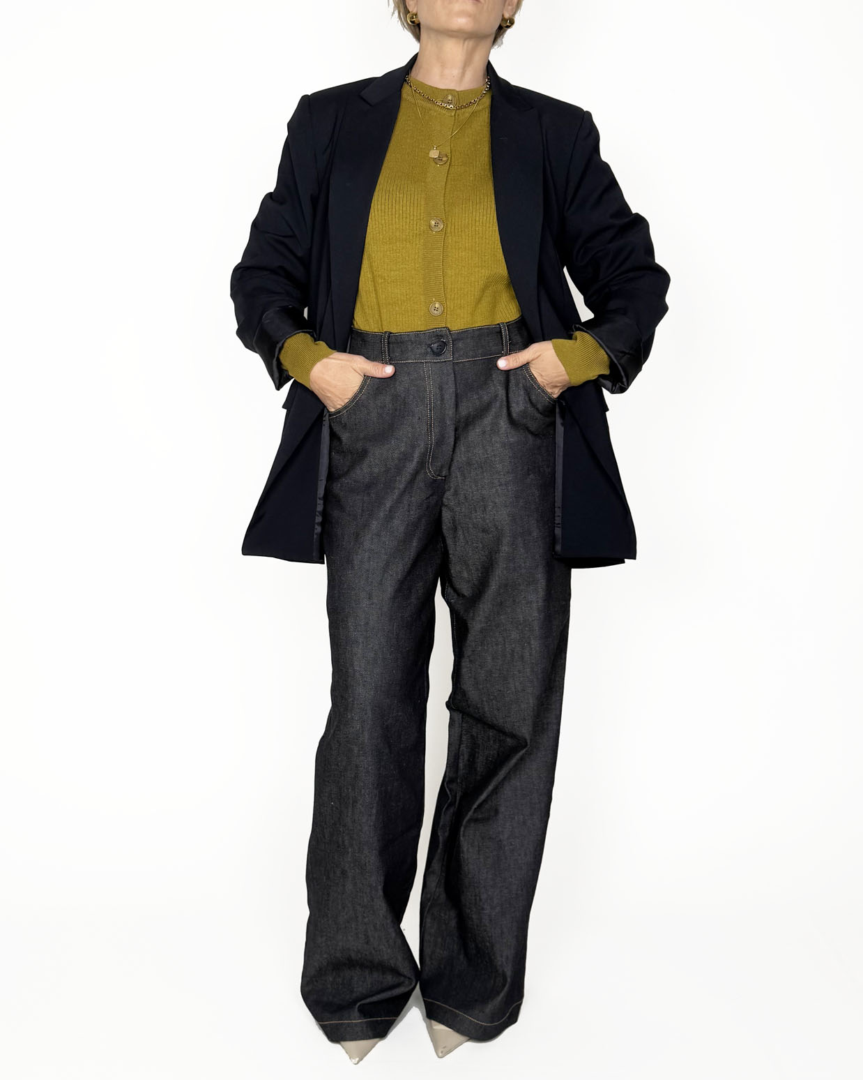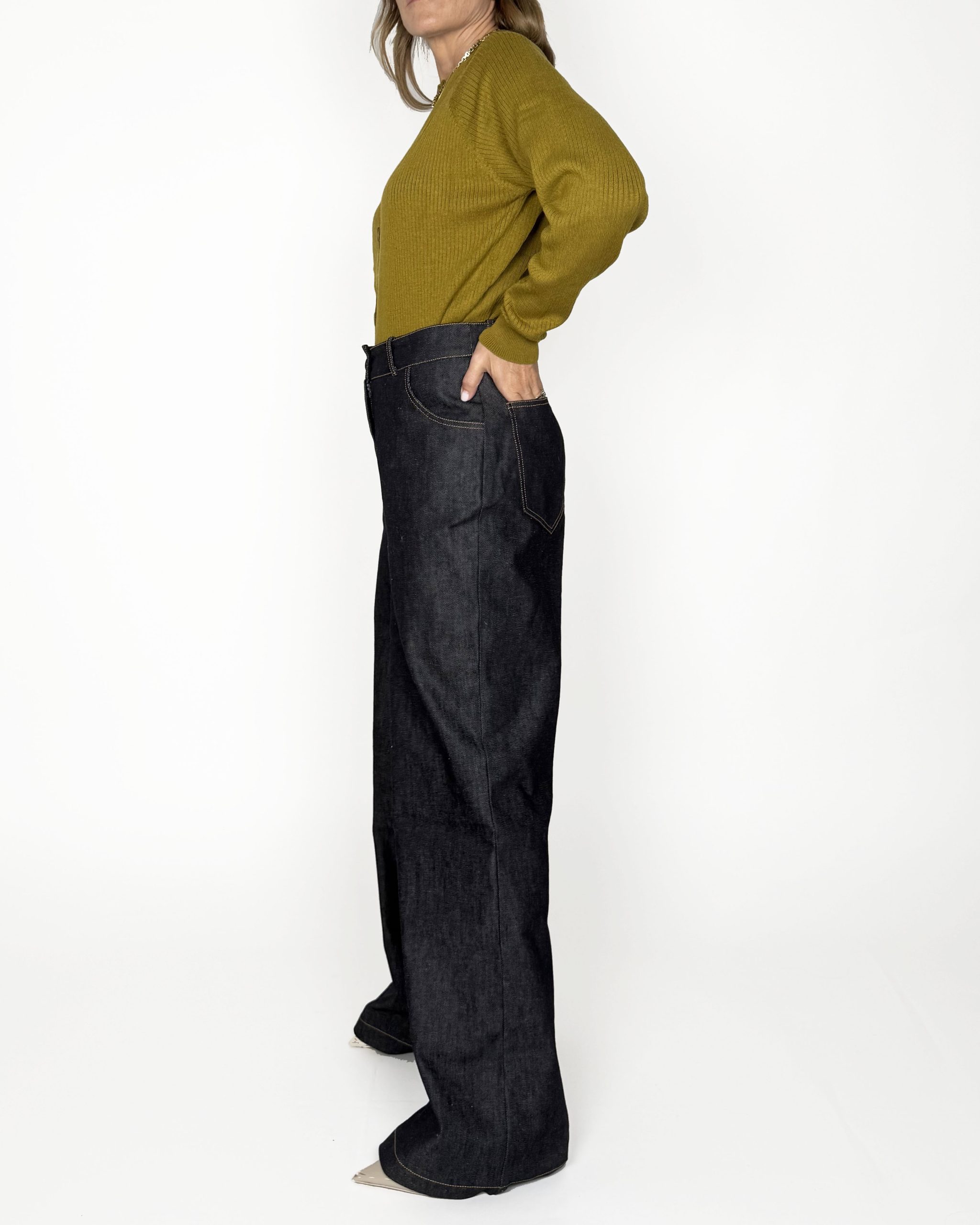Pantalone palazzo in tessuto denim 100%cotone, trattato con un jeans impunture color tabacco.