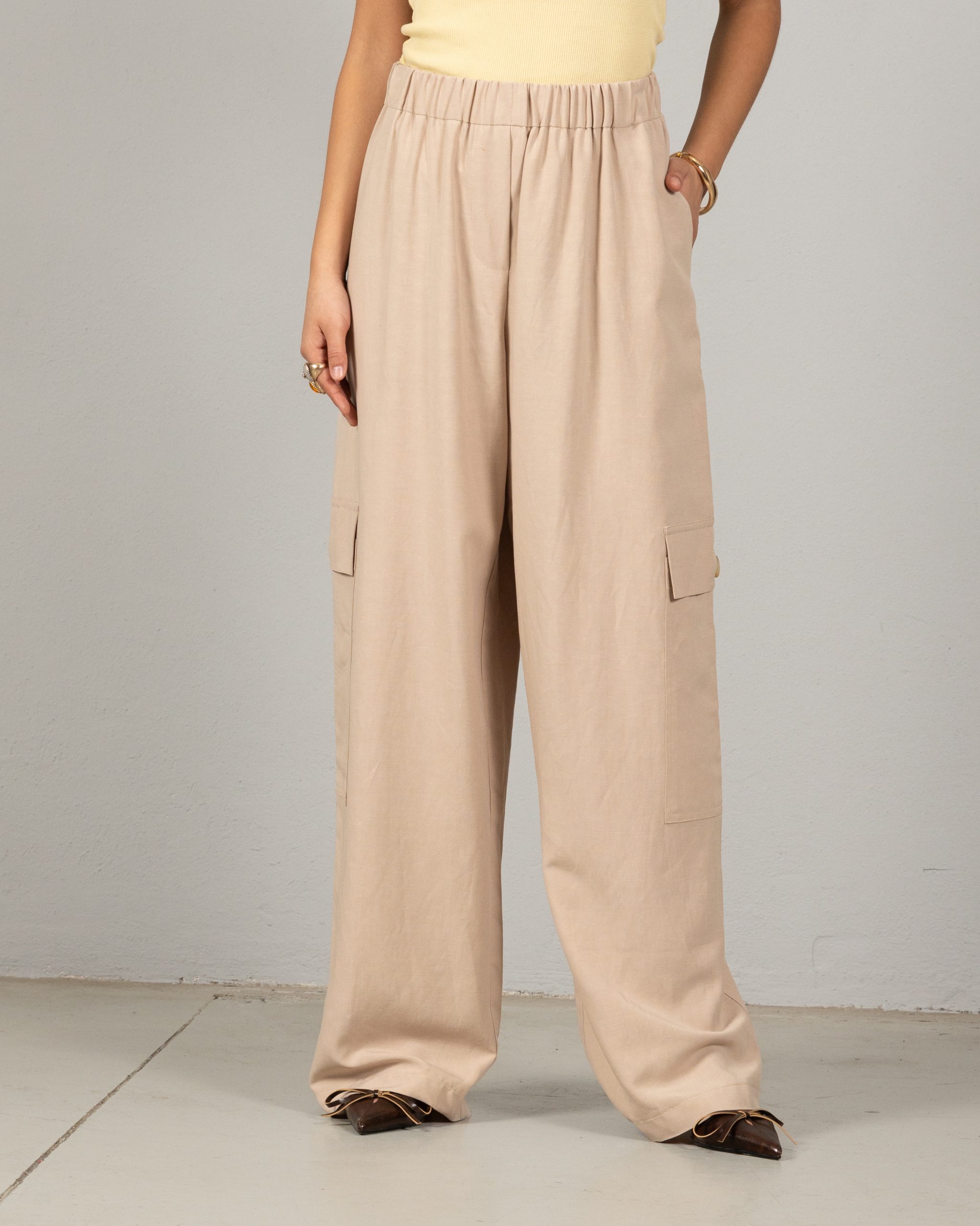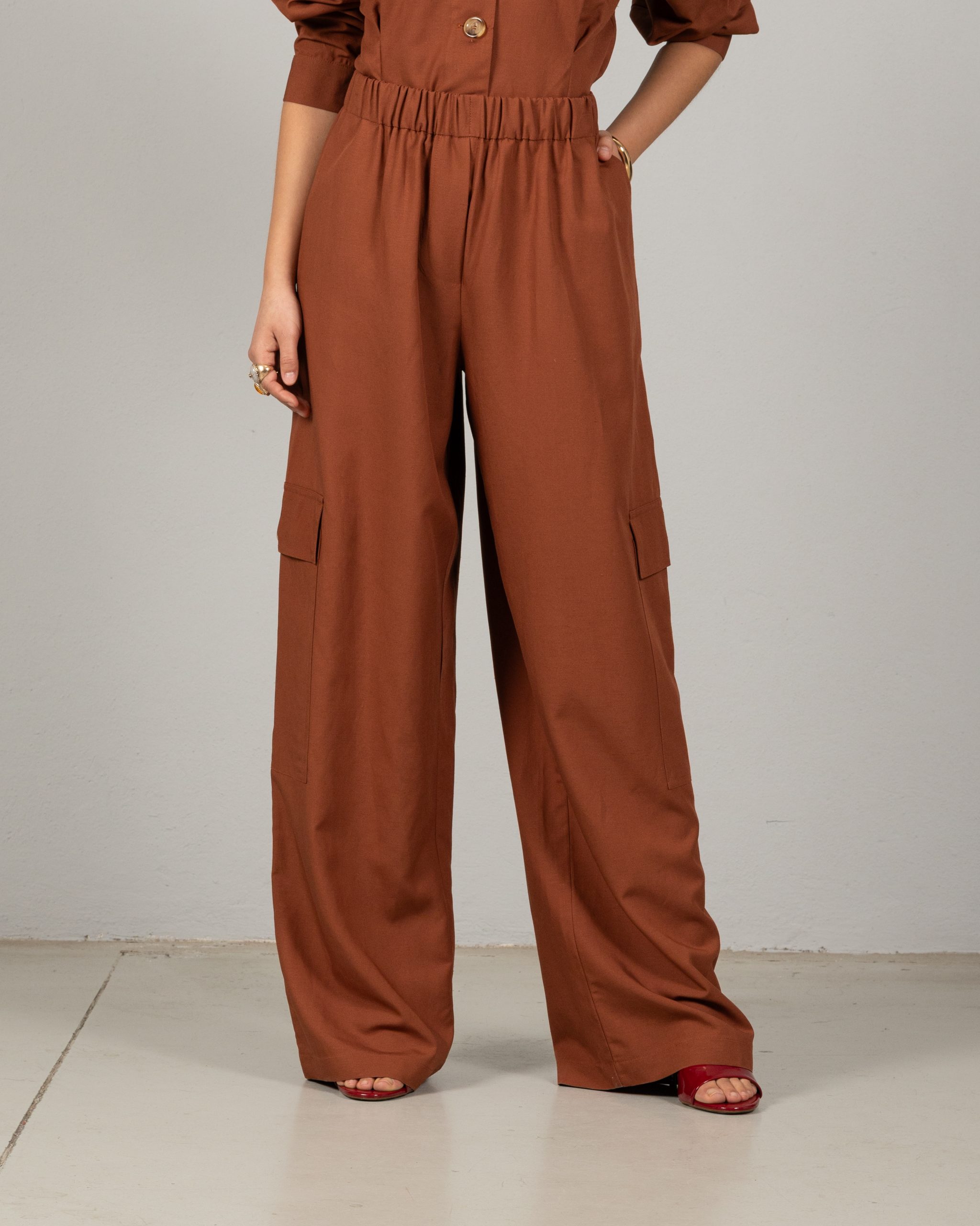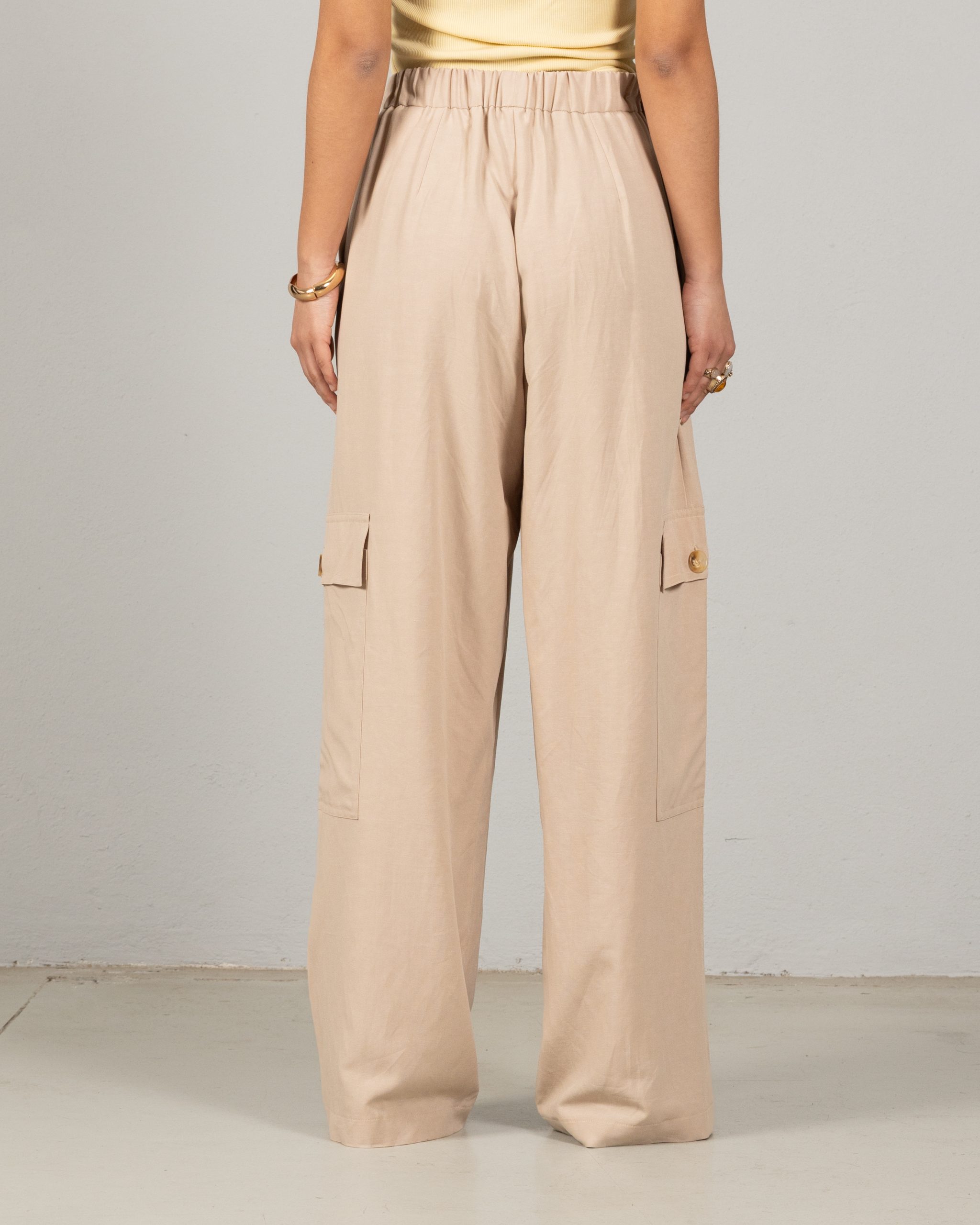 Pantalone comodo e confortevole realizzato in tessuto fluido misto viscosa lino dall’armatura leggermente fiammata. Linea ampa, elastico in vita e tasche laterali con bottone.