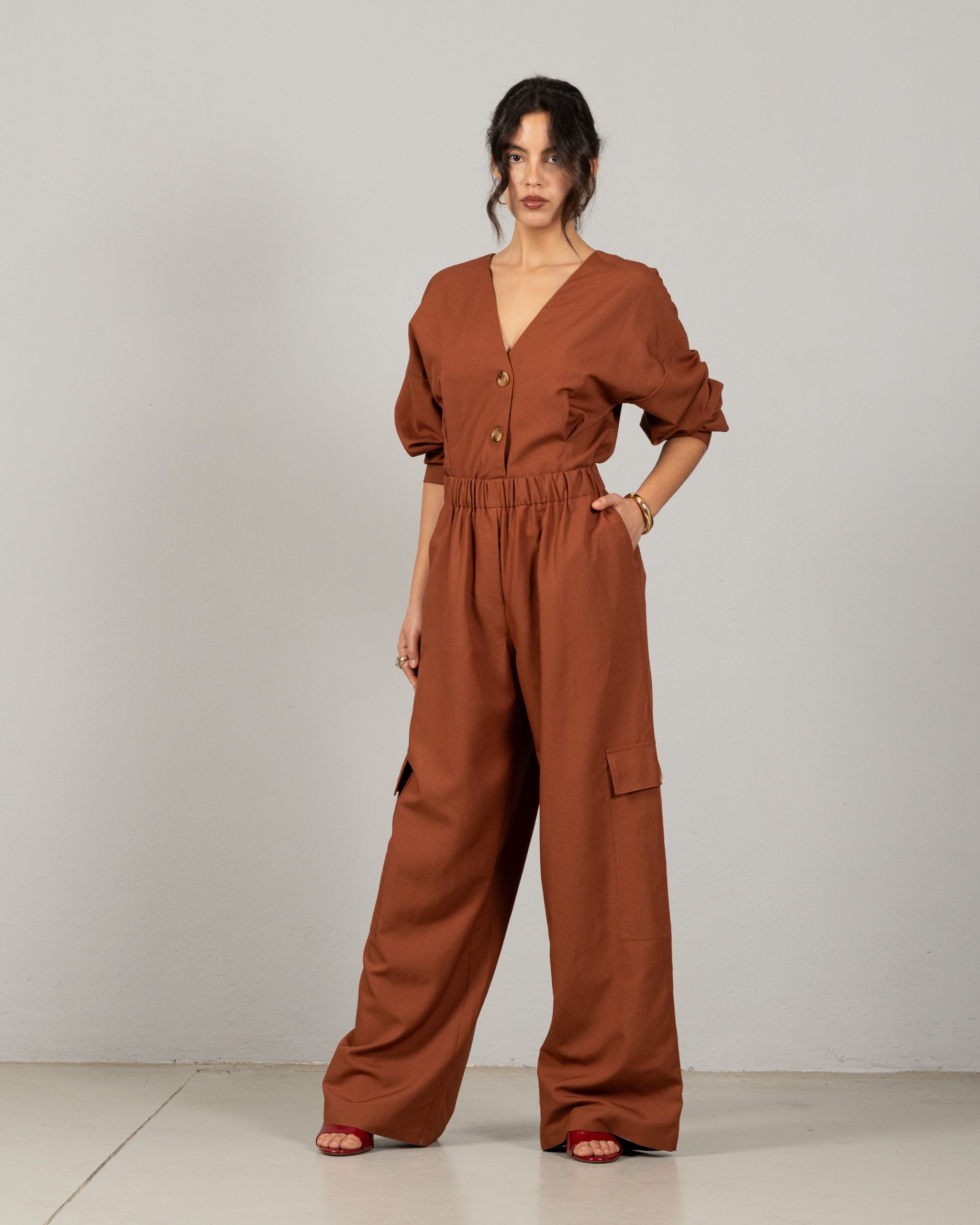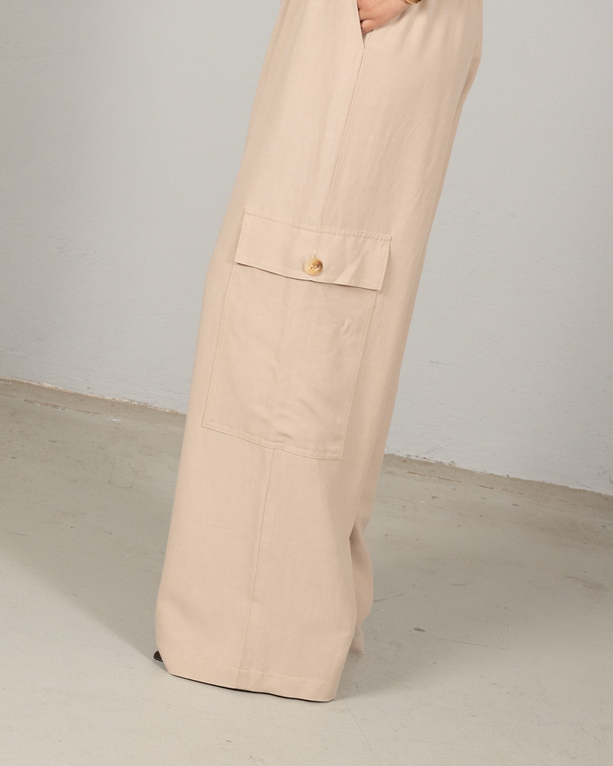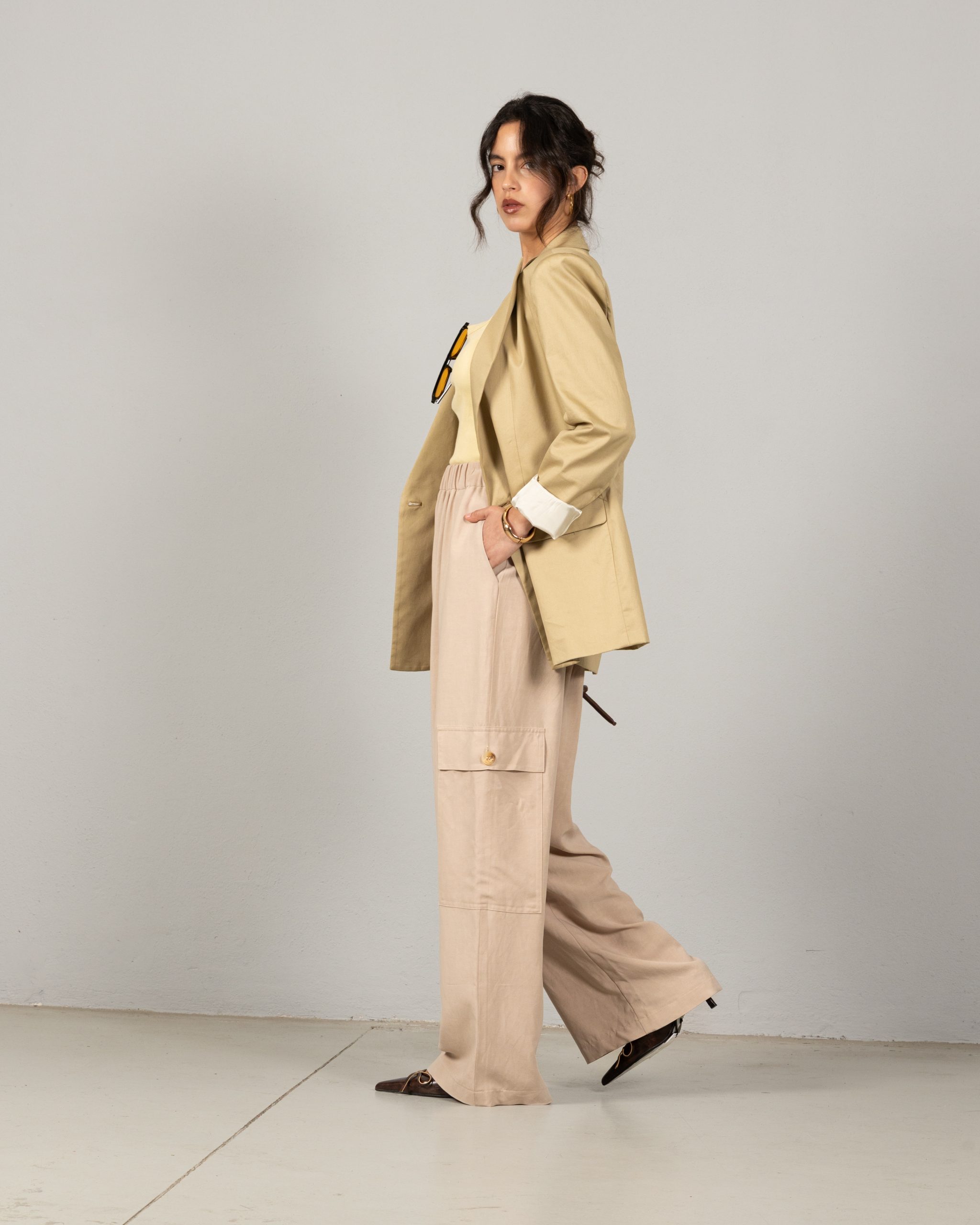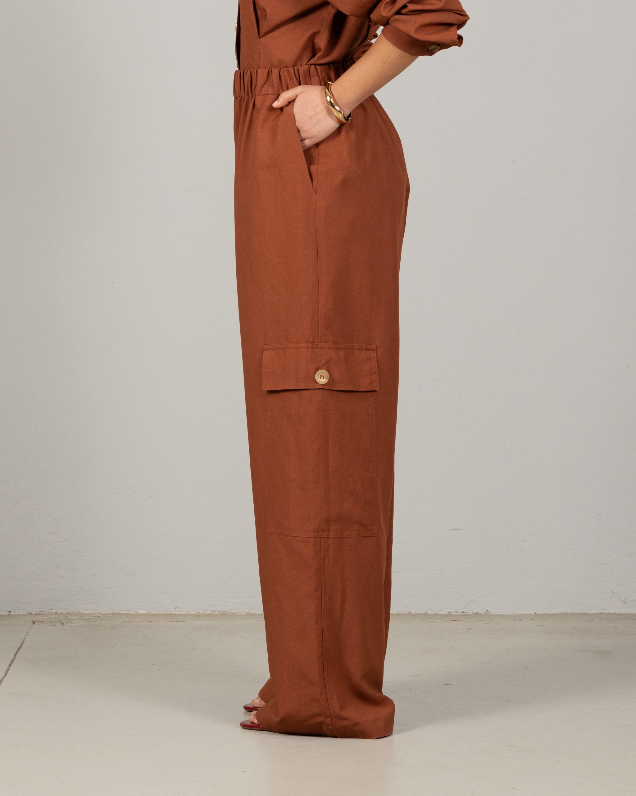 Pantalone comodo e confortevole realizzato in tessuto fluido misto viscosa lino dall’armatura leggermente fiammata. Linea ampa, elastico in vita e tasche laterali con bottone.